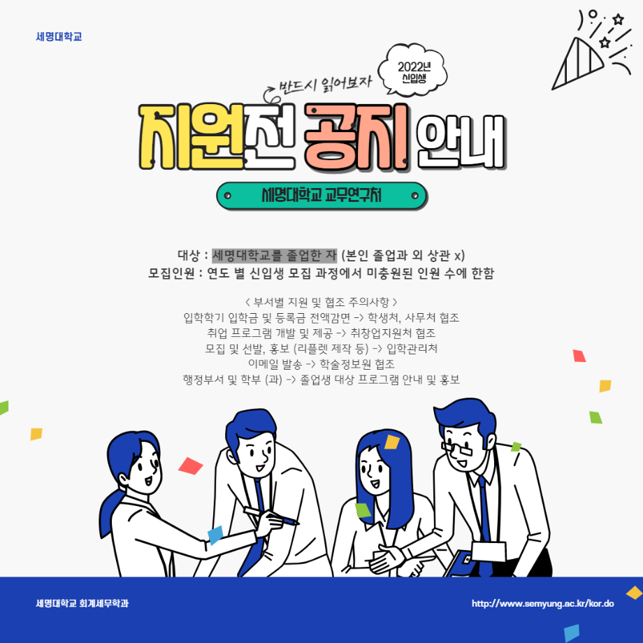 본문 시작 홈으로 학과소식 학과소개 취업정보 교육과정 학과소식 홈페이지가이드 포토갤러리 공지사항 포토갤러리 학과이야기 학과행사 포토갤러리 페이스북 트위터 프린트 세명대 졸업생 대상 신입학 모집공고 안내 회계세무학과 1843 2022-01-20 세명대학교 졸업생 대상 신입학 모집공고입니다. 목록 이전회계세무학과 추가모집 안내 다음 세명대학교 홍보자료 담당부서 : 회계세무학과 담당자 : - 연락처 : 043-649-1244 최종수정일 : 2024-10-26 만족도조사 만족도 조사 이 페이지에서 제공하는 정보에 대하여 만족하시나요? 매우만족 만족 보통 불만족 매우불만족