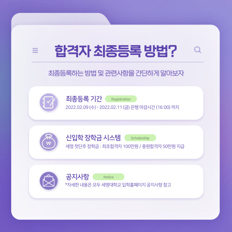 본문 시작 홈으로 학과소식 학과소개 취업정보 교육과정 학과소식 홈페이지가이드 포토갤러리 공지사항 포토갤러리 학과이야기 학과행사 포토갤러리 페이스북 트위터 프린트 22학년도 신입생 대상 합격자 최종등록 안내 회계세무학과 1949 2022-02-08 세명대학교 2022학년도 신입생 대상 합격자 최종등록 안내 목록 이전세명대 기숙사 신청 안내 다음 세명대학교 시설 총정리 담당부서 : 회계세무학과 담당자 : - 연락처 : 043-649-1244 최종수정일 : 2024-10-26 만족도조사 만족도 조사 이 페이지에서 제공하는 정보에 대하여 만족하시나요? 매우만족 만족 보통 불만족 매우불만족