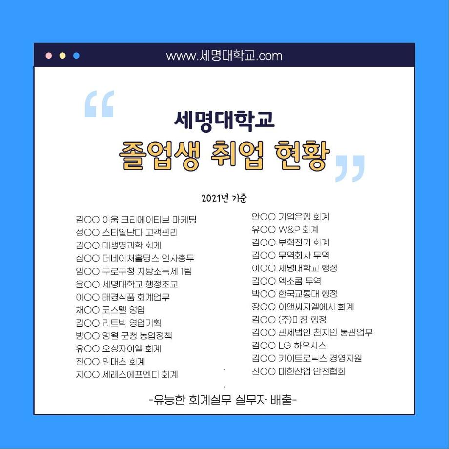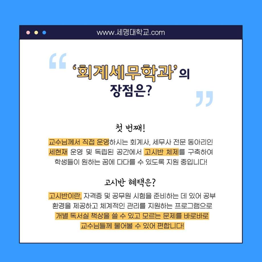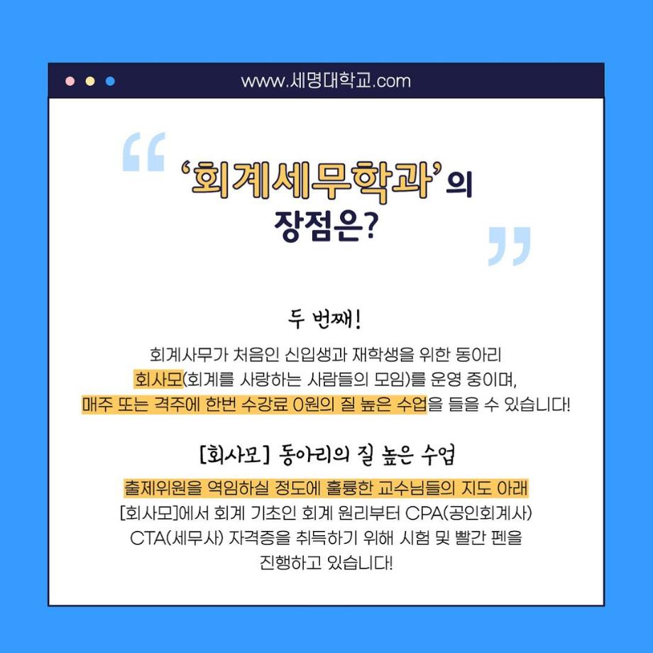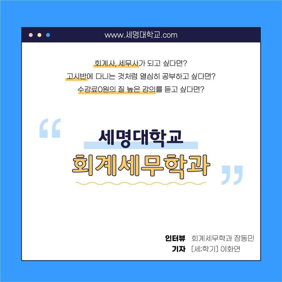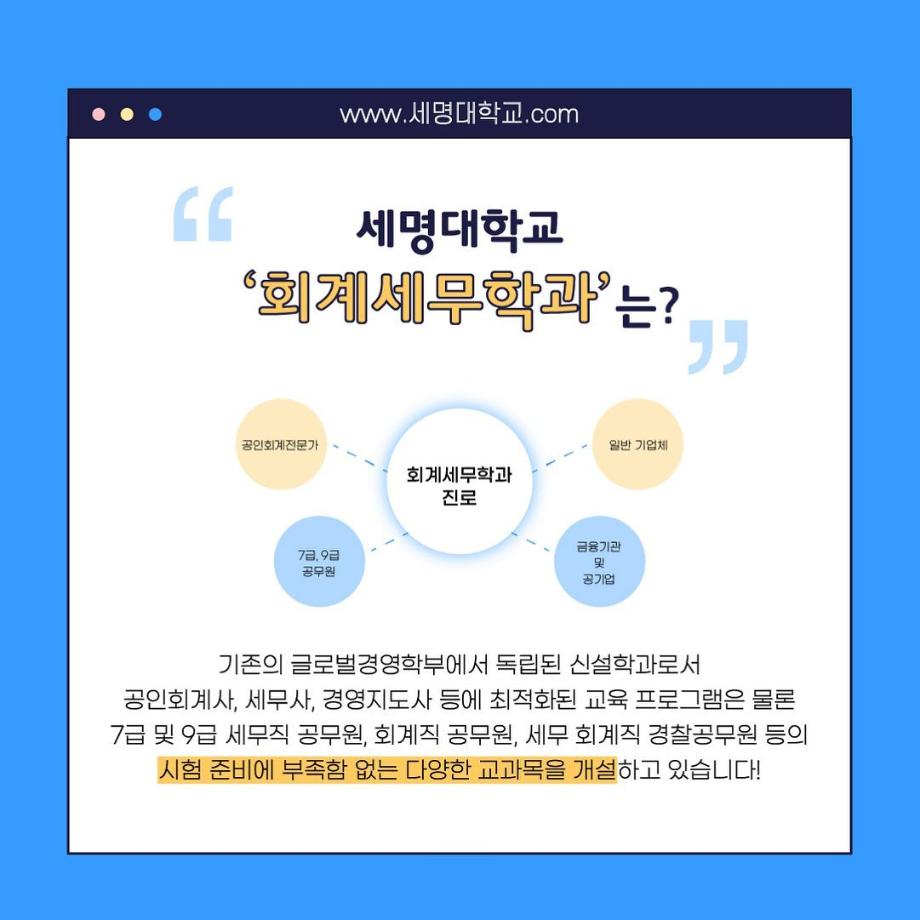 본문 시작 홈으로 학과소식 학과소개 취업정보 교육과정 학과소식 홈페이지가이드 포토갤러리 공지사항 포토갤러리 학과이야기 학과행사 포토갤러리 페이스북 트위터 프린트 우리 학과를 모두 보여줄게_회계세무학과 회계세무학과 1788 2022-09-14 우리 학과를 모두 보여줄게_'회계세무학과'편 목록 이전대학교 필수 술게임 다음 안영미의 대학 Pick! 세명대학교! 담당부서 : 회계세무학과 담당자 : - 연락처 : 043-649-1244 최종수정일 : 2024-10-26 만족도조사 만족도 조사 이 페이지에서 제공하는 정보에 대하여 만족하시나요? 매우만족 만족 보통 불만족 매우불만족