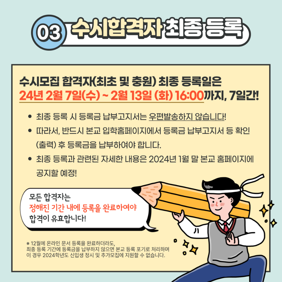 본문 시작 홈으로 학과소식 학과소개 취업정보 교육과정 학과소식 홈페이지가이드 포토갤러리 공지사항 포토갤러리 학과이야기 학과행사 포토갤러리 페이스북 트위터 프린트 2024 수시 등록기간 안내 회계세무학과 1803 2023-11-30 최초 합격자 등록기간: 2023년 12월 18일 (월) ~ 2023년 12월 21일 (목) 17:00시 까지 최초 합격자 등록방법: 본교 입학홈페이지 ’입학정보통합시스템‘에서 온라인 문서 등록 수시모집 합격자(최초 및 충원) 최종 등록일: 2024년 2월 7일 (수) ~ 2024년 2월 13일 (화) 16:00시 까지 목록 이전2023 청소년을 위한 빅 콘서트 「Go, High(고-하이) 콘서트」 다음 세명대학교 2024학년도 정시모집 안내 담당부서 : 회계세무학과 담당자 : - 연락처 : 043-649-1244 최종수정일 : 2024-10-26 만족도조사 만족도 조사 이 페이지에서 제공하는 정보에 대하여 만족하시나요? 매우만족 만족 보통 불만족 매우불만족