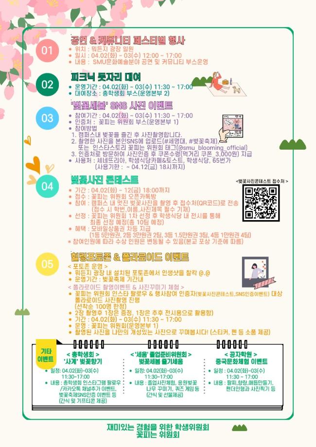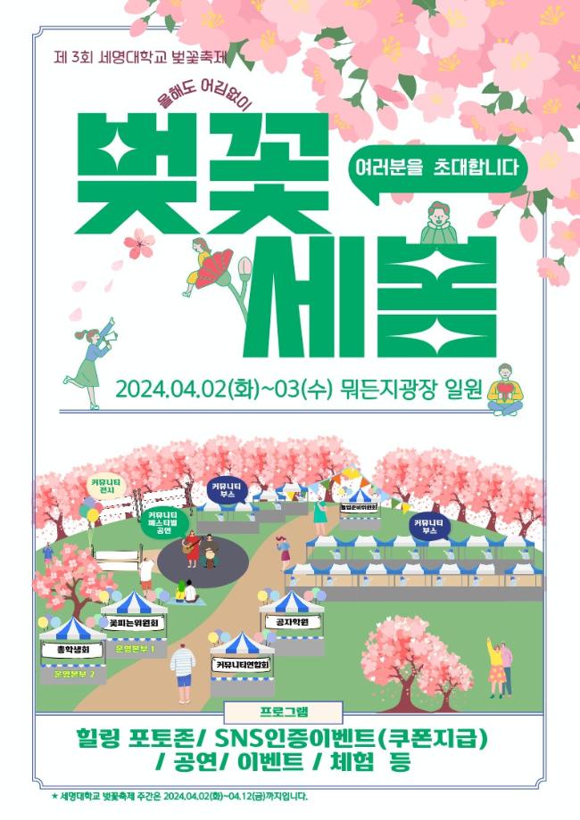 본문 시작 홈으로 학과소식 학과소개 취업정보 교육과정 학과소식 홈페이지가이드 포토갤러리 공지사항 포토갤러리 학과이야기 학과행사 포토갤러리 페이스북 트위터 프린트 🌸 제3회 벚꽃세봄 🌸 회계세무학과 1759 2024-03-29 🌸 올해도 어김없이, 제3회 벚꽃세봄 🌸 제3회 세명대학교 벚꽃축제, 벚꽃세봄에 여러분을 초대합니다! 힐링 포토존, SNS 인증 이벤트, 공연 등 다양한 프로그램과 함께 세명대학교의 벚꽃을 즐겨요🥰 💌 일자: 4월 2일(화) ~ 3일(수) 💌 장소: 뭐든지광장 일원 목록 이전제9회 커뮤니티 페스티벌 다음 [Book 콘서트] '김선태 (충TV)' Book 콘서트에 초대합니다. 담당부서 : 회계세무학과 담당자 : - 연락처 : 043-649-1244 최종수정일 : 2024-10-26 만족도조사 만족도 조사 이 페이지에서 제공하는 정보에 대하여 만족하시나요? 매우만족 만족 보통 불만족 매우불만족