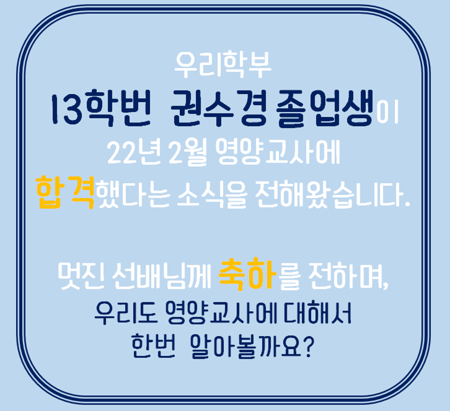 본문 시작 홈으로 커뮤니티 학부소개 진로·취업 교육과정 커뮤니티 대학원 입학상담 홈페이지가이드 갤러리 공지사항 갤러리 학생회 동문회 전공자료실 전공동아리 Youtube Instagram 갤러리 페이스북 트위터 프린트 13학번 권수경 영양교사 합격 바이오식품영양학부 2208 2022-05-23 13학번 권수경 졸업생 영양교사 합격 목록 이전2022 새내기 두드림 다음 2022 식품관련 뉴스 담당부서 : 바이오식품영양학부 담당자 : - 연락처 : 043-649-1430 최종수정일 : 2024-10-26 만족도조사 만족도 조사 이 페이지에서 제공하는 정보에 대하여 만족하시나요? 매우만족 만족 보통 불만족 매우불만족