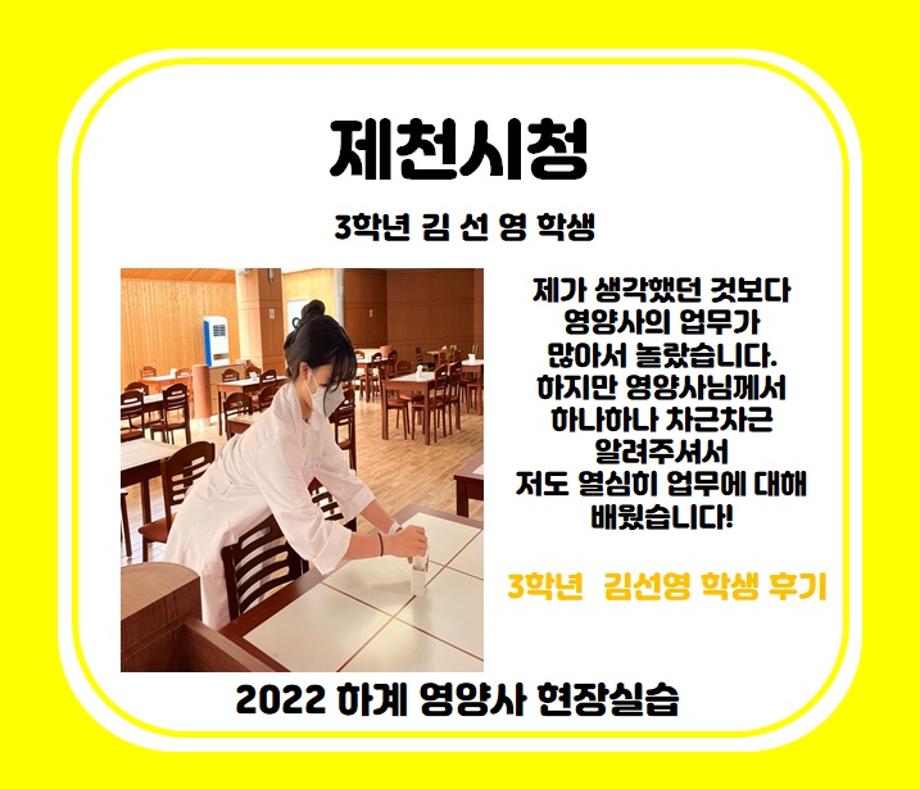 본문 시작 홈으로 커뮤니티 학부소개 진로·취업 교육과정 커뮤니티 대학원 입학상담 홈페이지가이드 갤러리 공지사항 갤러리 학생회 동문회 전공자료실 전공동아리 Youtube Instagram 갤러리 페이스북 트위터 프린트 2022 하계영양사 현장실습(제천시청) 바이오식품영양학부 2032 2022-07-13 목록 이전2022 하계영양사 현장실습(세명고등학교) 다음 2022 하계영양사 현장실습(동일여자고등학교) 담당부서 : 바이오식품영양학부 담당자 : - 연락처 : 043-649-1430 최종수정일 : 2024-10-26 만족도조사 만족도 조사 이 페이지에서 제공하는 정보에 대하여 만족하시나요? 매우만족 만족 보통 불만족 매우불만족