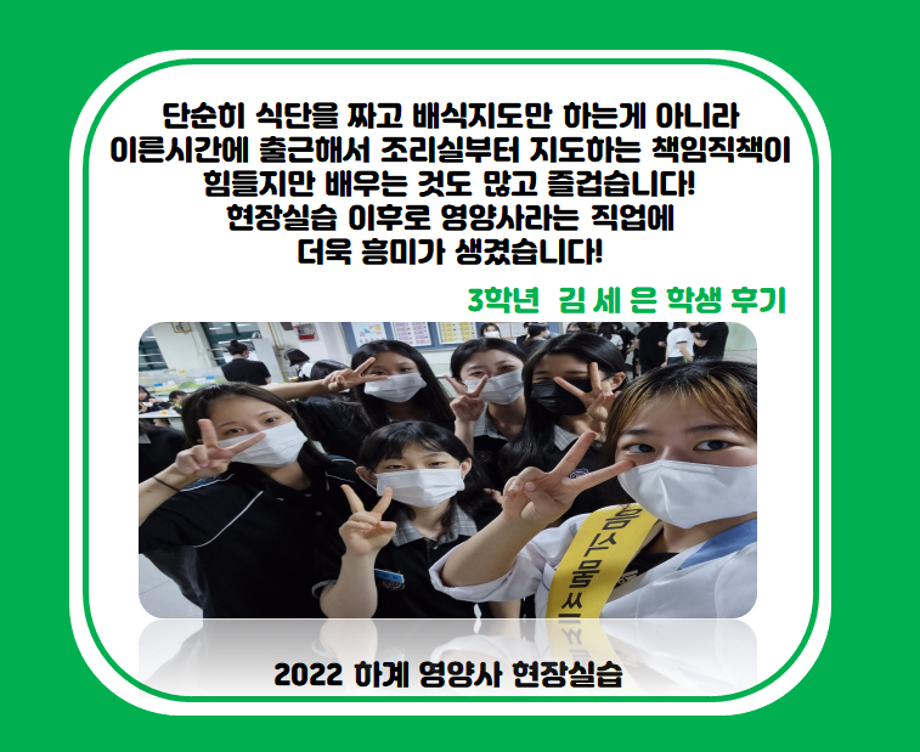 본문 시작 홈으로 커뮤니티 학부소개 진로·취업 교육과정 커뮤니티 대학원 입학상담 홈페이지가이드 갤러리 공지사항 갤러리 학생회 동문회 전공자료실 전공동아리 Youtube Instagram 갤러리 페이스북 트위터 프린트 2022 하계영양사 현장실습(동일여자고등학교) 바이오식품영양학부 1999 2022-07-13 목록 이전2022 하계영양사 현장실습(제천시청) 다음 2022 하계영양사 현장실습(목원푸드 코레일 승무원기숙식당) 담당부서 : 바이오식품영양학부 담당자 : - 연락처 : 043-649-1430 최종수정일 : 2024-10-26 만족도조사 만족도 조사 이 페이지에서 제공하는 정보에 대하여 만족하시나요? 매우만족 만족 보통 불만족 매우불만족