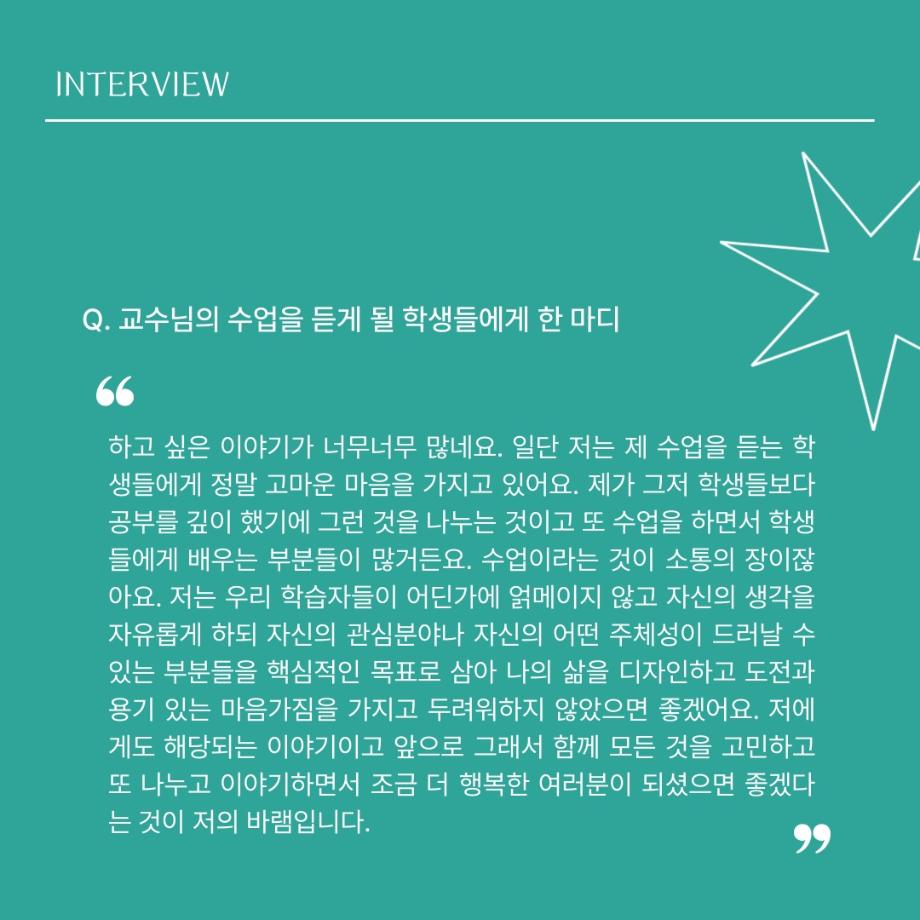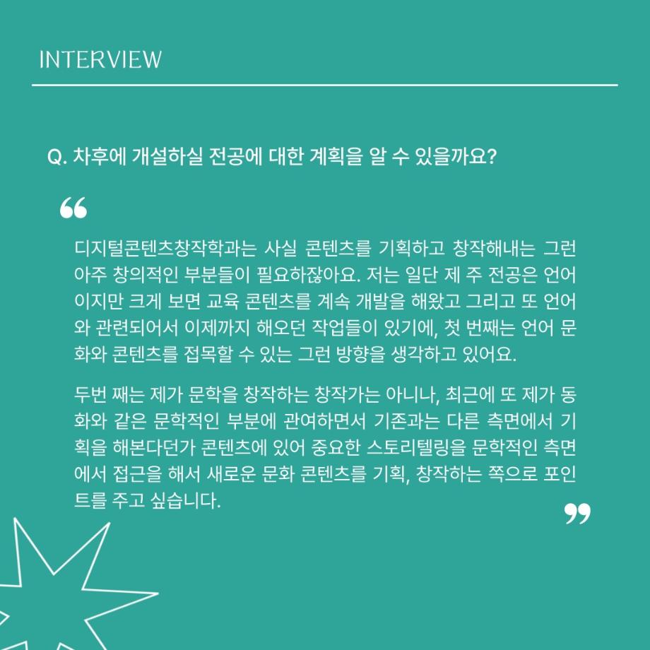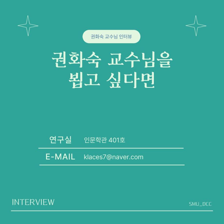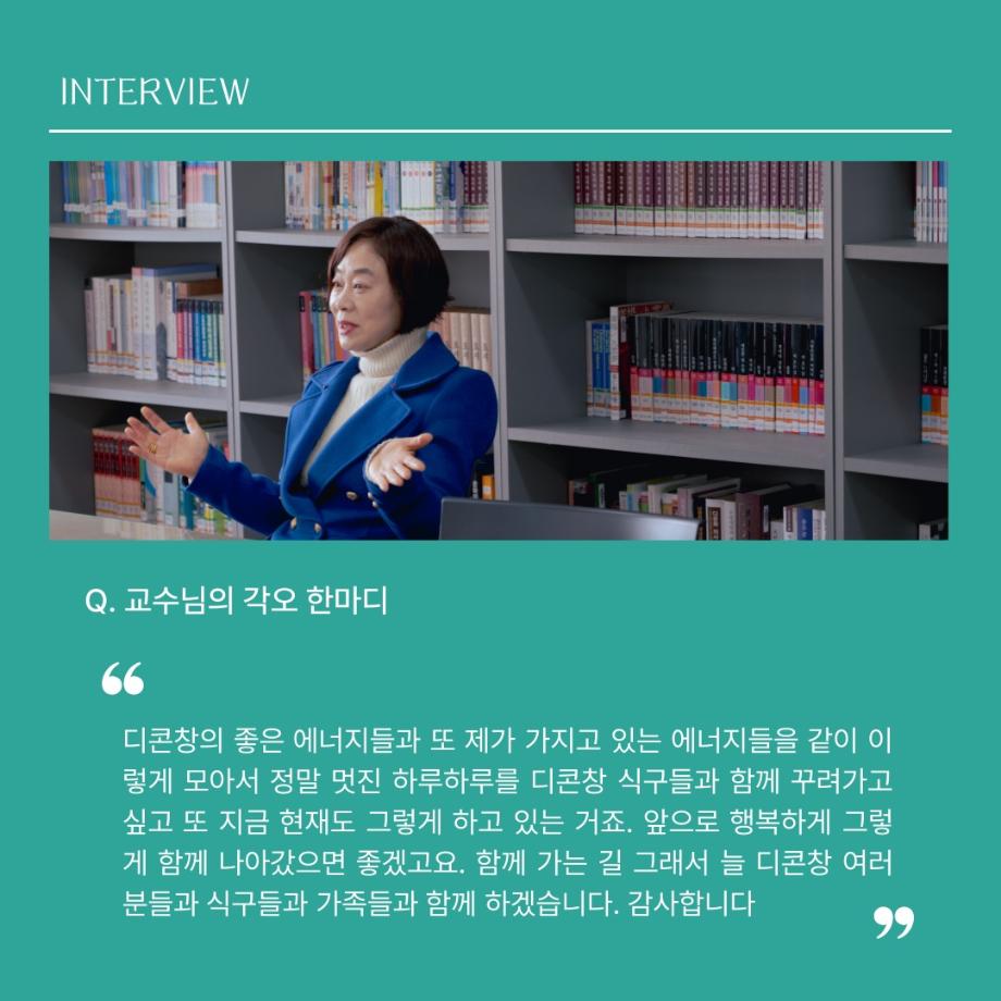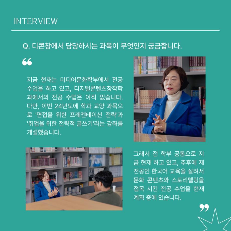 본문 시작 홈으로 MCC News 학과소개 교수소개 학과과정 MCC News MCC SNS 홈페이지가이드 교수 및 졸업생 학과 및 재학생 교수 및 졸업생 미디어 정보통 교수 및 졸업생 페이스북 트위터 프린트 디지털콘텐츠창작학과 권화숙 교수님 인터뷰 📸 디지털콘텐츠창작학과 2613 2024-04-17 작년 2023년 2학기부터 디지털콘텐츠창작학과로 오시게 된 권화숙 교수님을 모시고 인터뷰를 진행하였습니다! 권교수님의 각오와 향후 계획에 대한 이야기를 함께 들어봐요 😚 목록 이전세명대 김기태 교수와 디자인인포 박재원 대표, 9년째 장학금 기탁 다음 디지털콘텐츠창작학과 김기태 교수님 인터뷰 📸 담당부서 : 미디어콘텐츠창작학과 담당자 : - 연락처 : 043-649-1741 최종수정일 : 2024-10-26 만족도조사 만족도 조사 이 페이지에서 제공하는 정보에 대하여 만족하시나요? 매우만족 만족 보통 불만족 매우불만족