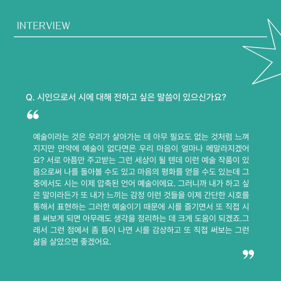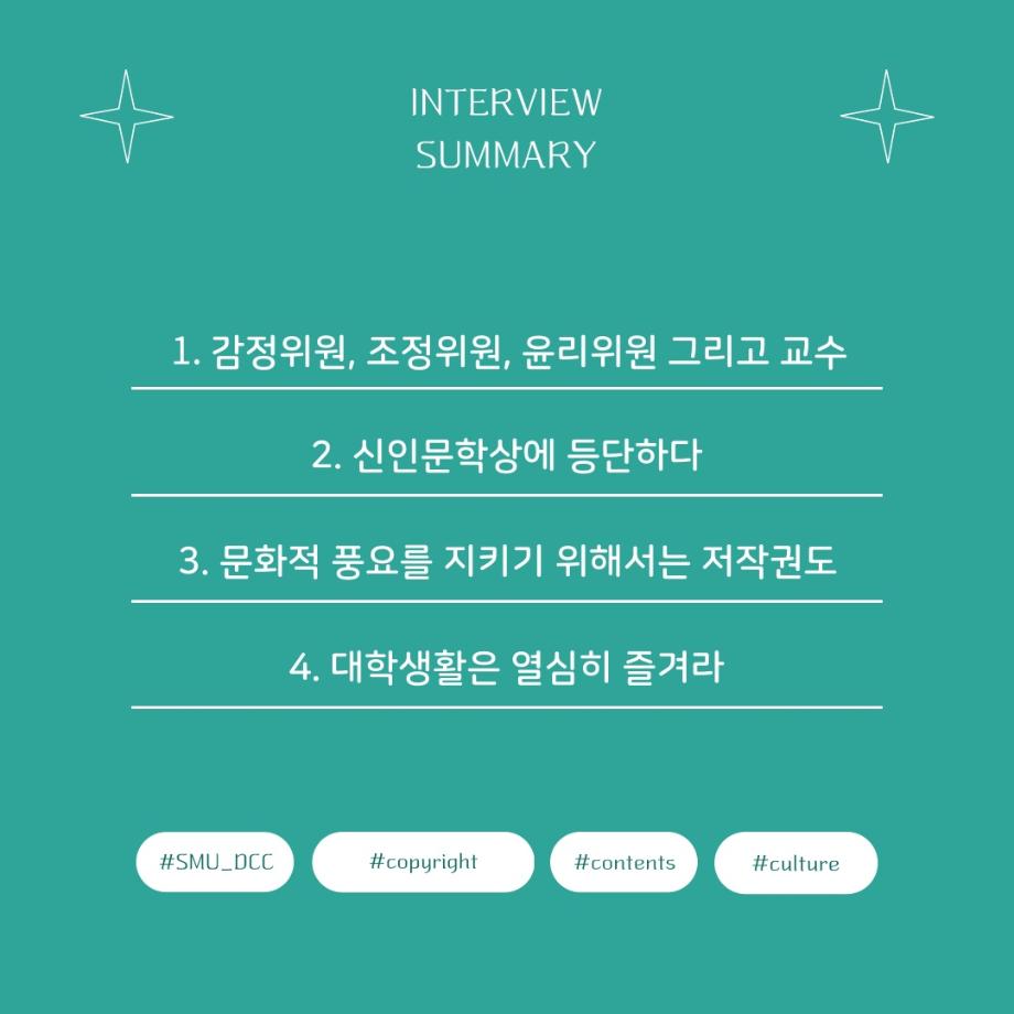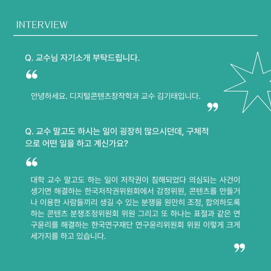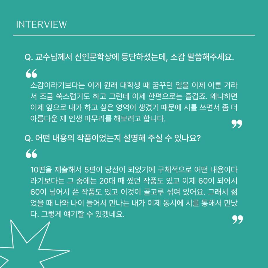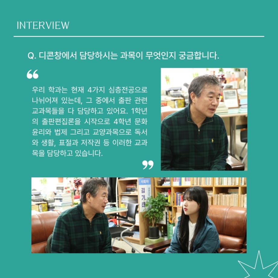 본문 시작 홈으로 MCC News 학과소개 교수소개 학과과정 MCC News MCC SNS 홈페이지가이드 교수 및 졸업생 학과 및 재학생 교수 및 졸업생 미디어 정보통 교수 및 졸업생 페이스북 트위터 프린트 디지털콘텐츠창작학과 김기태 교수님 인터뷰 📸 디지털콘텐츠창작학과 2447 2024-04-24 한국 저작권에서 빼놓을 수 없는 인물이자 중견 문예지 ‘계간 시현실’에 2024 신인문학상에 당선되어 신인 시인이 되신 김기태 교수님을 모시고 인터뷰했습니다. 다양한 활동을 해오신 김기태 교수님의 한 말씀 우리 함께 들어봐요! 목록 이전디지털콘텐츠창작학과 권화숙 교수님 인터뷰 📸 다음 📚디지털콘텐츠창작학과 권화숙 교수님 저자 동화책 소개📚 담당부서 : 미디어콘텐츠창작학과 담당자 : - 연락처 : 043-649-1741 최종수정일 : 2024-10-26 만족도조사 만족도 조사 이 페이지에서 제공하는 정보에 대하여 만족하시나요? 매우만족 만족 보통 불만족 매우불만족
