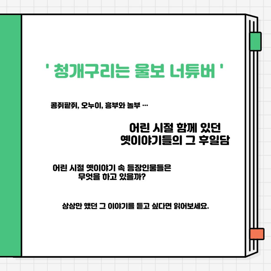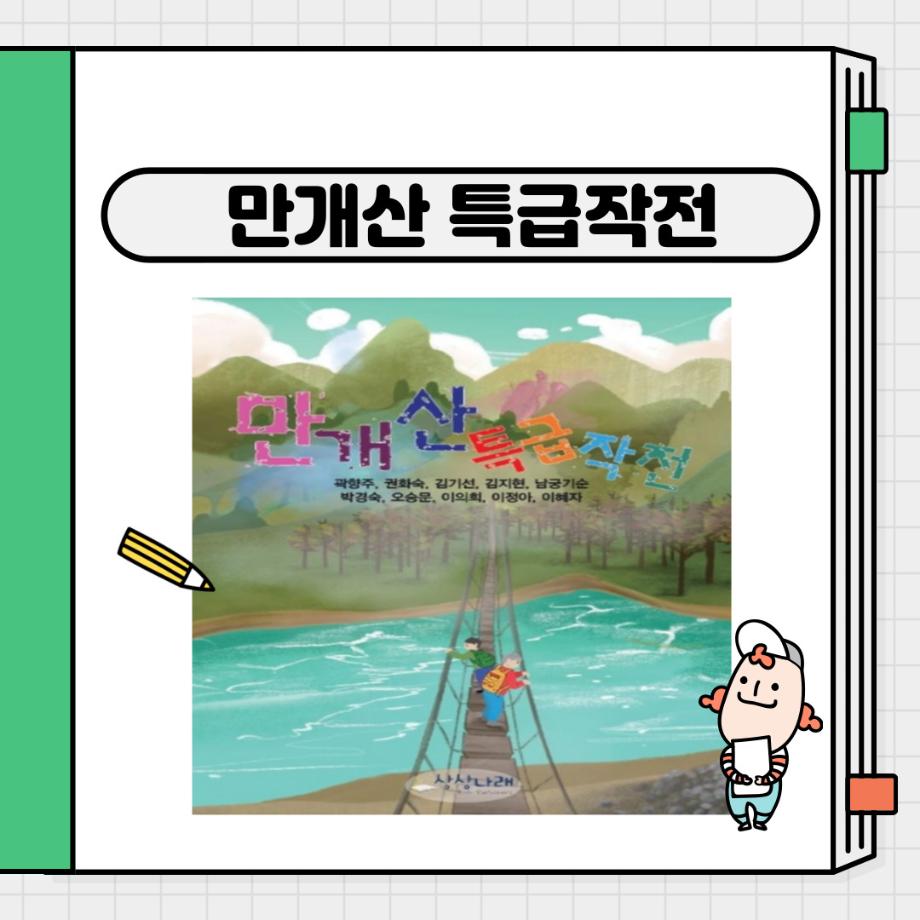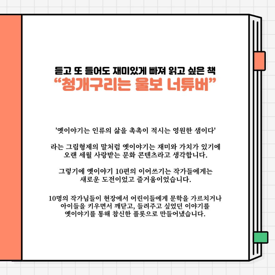 권화숙 교수님 외 9명의 작가님들이 쓰신 청개구리와 울보 너튜버 속 만개산 특급 작전입니다. 10가지의 이야기들이 담겨있으며 작은 도전들과 도전으로 인한 성공이야기, 자신이 가지고 있는 긍정적인 힘으로 멋진 일을 만들어 가는 이야기들을 담고 있습니다.