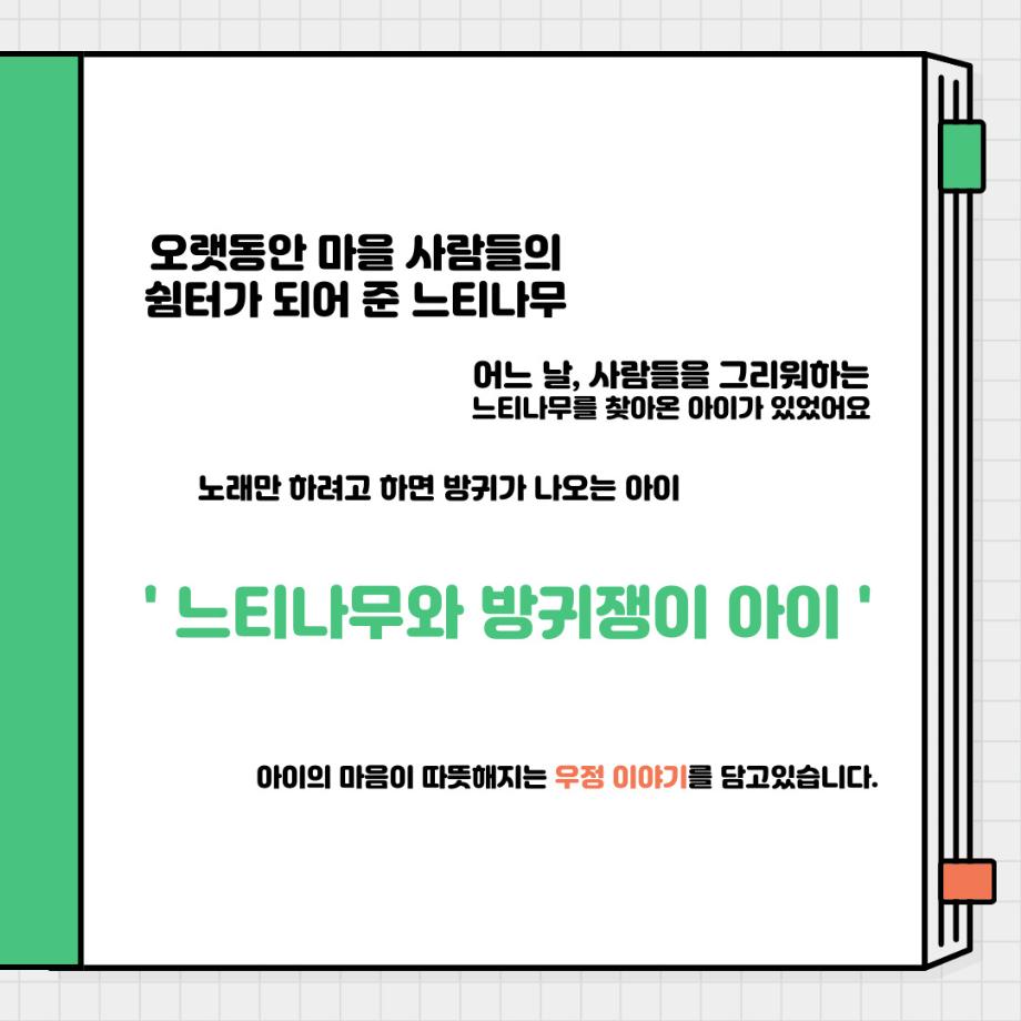 어느 날, 사람들을 그리워하는 느티나무를 찾아온 아이가 있었어요. 노래만 하려고 하면 방귀가 나오는 아이. 느티나무와 방귀쟁이 아이의 마음 이 따뜻해지는 우정 이야기를 담고있습니다.