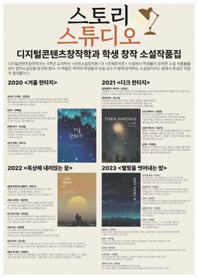 본문 시작 홈으로 MCC News 학과소개 교수소개 학과과정 MCC News MCC SNS 홈페이지가이드 교수 및 졸업생 학과 및 재학생 교수 및 졸업생 미디어 정보통 교수 및 졸업생 페이스북 트위터 프린트 디지털콘텐츠창작학과 학생 창작 소설작품집 디지털콘텐츠창작학과 2630 2024-05-16 디지털콘텐츠창작학과는 4학년 교과목인 <단편소설창작론>과 <문예창작론> 수업에서 학생들이 창작한 소설 작품들을 모아 창작소설집을 발간해왔습니다. 이 책들은 학과의 학생들과 전공 교수가 함께 창작하는 소설집이라는 첨에서 뜻깊은 작업의 결과물입니다. 2020<겨울 판타지> 2021<다크 판타지> 2022<옥상에 내려앉는 꿈> 2023<별빛을 씻어내는 밤> 이렇게 총 4권의 책들이 있는데요 4권 모두 훌륭한 작품성을 띠고있으니 한 번씩 읽어보시는 것 어떨까요? 목록 이전📚디지털콘텐츠창작학과 권화숙 교수님 저자 동화책 소개📚 다음 권화숙 교수님의 5월 신간 소개 담당부서 : 미디어콘텐츠창작학과 담당자 : - 연락처 : 043-649-1741 최종수정일 : 2024-10-26 만족도조사 만족도 조사 이 페이지에서 제공하는 정보에 대하여 만족하시나요? 매우만족 만족 보통 불만족 매우불만족