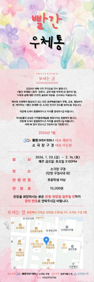 본문 시작 홈으로 MCC News 학과소개 교수소개 학과과정 MCC News MCC SNS 홈페이지가이드 교수 및 졸업생 학과 및 재학생 교수 및 졸업생 미디어 정보통 교수 및 졸업생 페이스북 트위터 프린트 권화숙 교수님 희곡 빨간우체통 공연 안내 미디어콘텐츠창작학과 1118 2026-01-16 권화숙 교수님께서 작성하신 희곡 작품 '빨간우체통'이 연극무대에 올려지게 되었습니다. 자세한 내용은 위 사진을 참고해주시면 됩니다. 목록 이전권화숙 교수님 향기로운 삶, 문인화 전시회 안내 다음 김기태 교수님, 처음책방 네 번째 기획전시 "시대의 거울, 우리잡지 창간호 100선" 담당부서 : 미디어콘텐츠창작학과 담당자 : - 연락처 : 043-649-1741 최종수정일 : 2024-10-26 만족도조사 만족도 조사 이 페이지에서 제공하는 정보에 대하여 만족하시나요? 매우만족 만족 보통 불만족 매우불만족