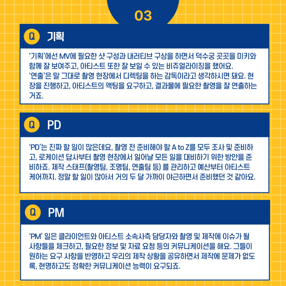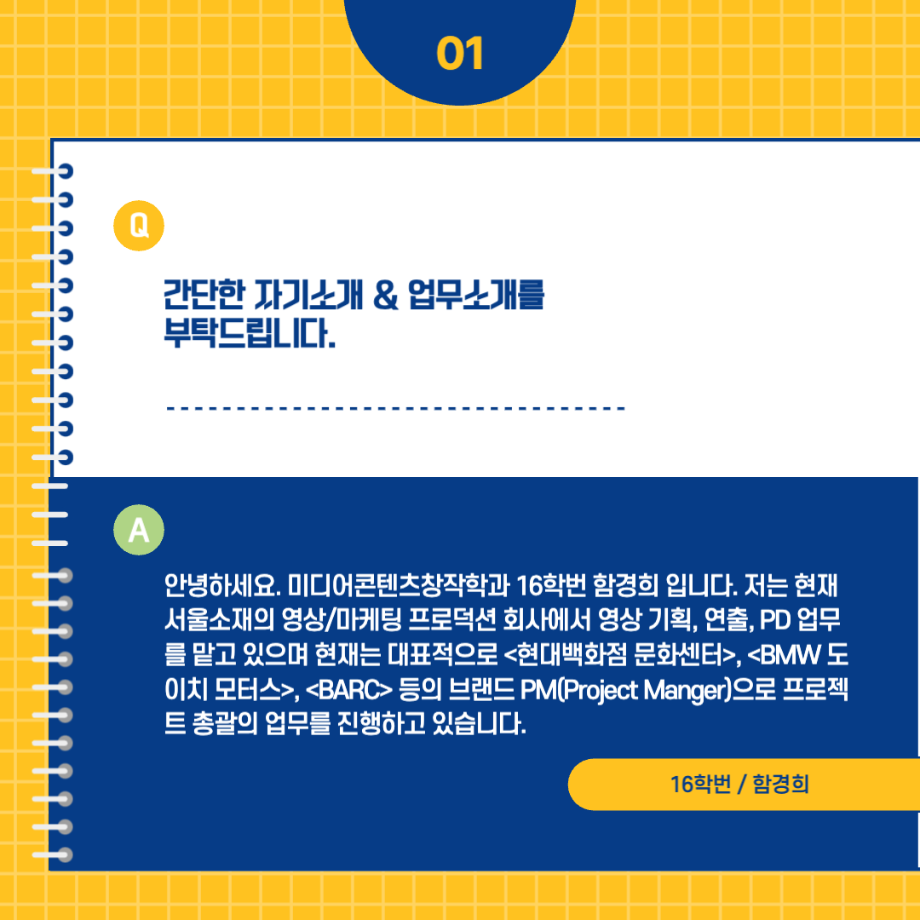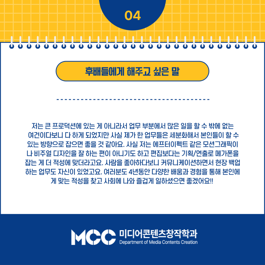 본문 시작 홈으로 MCC News 학과소개 교수소개 학과과정 MCC News MCC SNS 홈페이지가이드 교수 및 졸업생 학과 및 재학생 교수 및 졸업생 미디어 정보통 교수 및 졸업생 페이스북 트위터 프린트 🗣16학번 선배님의 현장 노하우🗣 미디어콘텐츠창작학과 3766 2024-10-24 오늘은 미디어콘텐츠창작학과를 졸업하신 16학번 함경희 선배님의 인터뷰를 진행했습니다 선배님이 현장에서 얻은 노하우와 소중한 경험들을 인터뷰를 통해 확인해보세요! 목록 이전권화숙 교수님의 동시집 '음식 말놀이'를 소개합니다! 다음 세명대 김기태 교수와 ㈜인포 박재원 대표, 10년째 장학금 기탁 담당부서 : 미디어콘텐츠창작학과 담당자 : - 연락처 : 043-649-1741 최종수정일 : 2024-10-26 만족도조사 만족도 조사 이 페이지에서 제공하는 정보에 대하여 만족하시나요? 매우만족 만족 보통 불만족 매우불만족