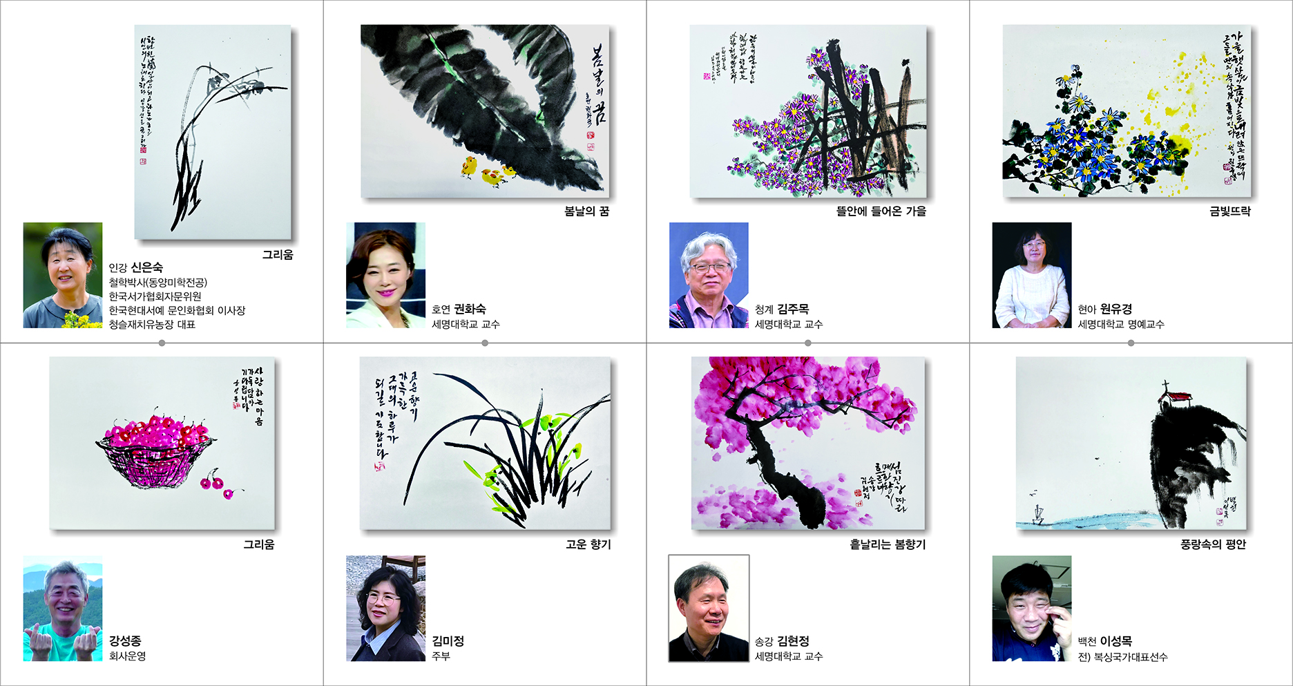 본문 시작 홈으로 MCC News 학과소개 교수소개 학과과정 MCC News MCC SNS 홈페이지가이드 교수 및 졸업생 학과 및 재학생 교수 및 졸업생 미디어 정보통 교수 및 졸업생 페이스북 트위터 프린트 권화숙 교수님 향기로운 삶, 문인화 전시회 안내 미디어콘텐츠창작학과 1134 2025-12-04 향기로운 삶,문인화' 강좌 수강생들의 그동안의 배움과 성과를 공유하는 2025년 제5회 문인화전 – 「여백의 시간을 거닐다 II」 전시회를 개최합니다. 📍 전시 안내 [일시] 개막식: 2025년 12월 4일(목) 16:00 전시기간: 2025년 12월 4일(목) 16:00–18:00 2025년 12월 5일(금)–12월 8일(월) 10:00–17:00 [장소] 제천시민회관 2층 전시실(충북 제천시 의림대로 125) 목록 이전권화숙 교수님, 공연 「허재비고블린의 꿈」 출연 다음 권화숙 교수님 희곡 빨간우체통 공연 안내 담당부서 : 미디어콘텐츠창작학과 담당자 : - 연락처 : 043-649-1741 최종수정일 : 2024-10-26 만족도조사 만족도 조사 이 페이지에서 제공하는 정보에 대하여 만족하시나요? 매우만족 만족 보통 불만족 매우불만족