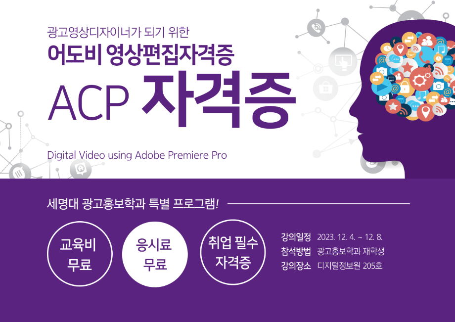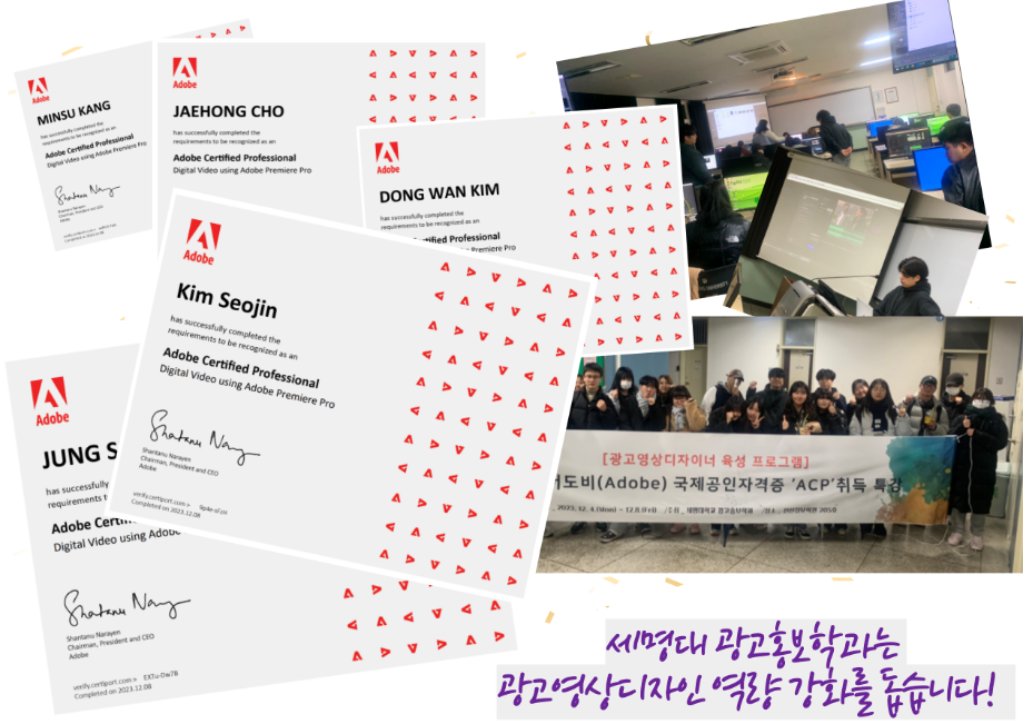 본문 시작 홈으로 특별CC프로그램 매력적인 학과소개 흥미로운 교육과정 특별CC프로그램 We can 취업 따뜻한 커뮤니티 홈페이지가이드 광고디자인 자격증취득 광고영상 제작실습 광고디자인 자격증취득 C&E(도전!경험!) 광고디자인 자격증취득 페이스북 트위터 프린트 [경축]광고영상제작편집 자격증 전원 취득 광고홍보학과 1901 2024-01-04 광고홍보학과에서 지원하는 광고영상디자인 역량 강화 프로그램 어도비( Adobe) 국제 공인 자격증 ACP 전원 취득을 축하합니다! 목록 이전Adobe Premier Pro 자격증 취득 다음 Adobe 포토샵 자격증 전원 합격
