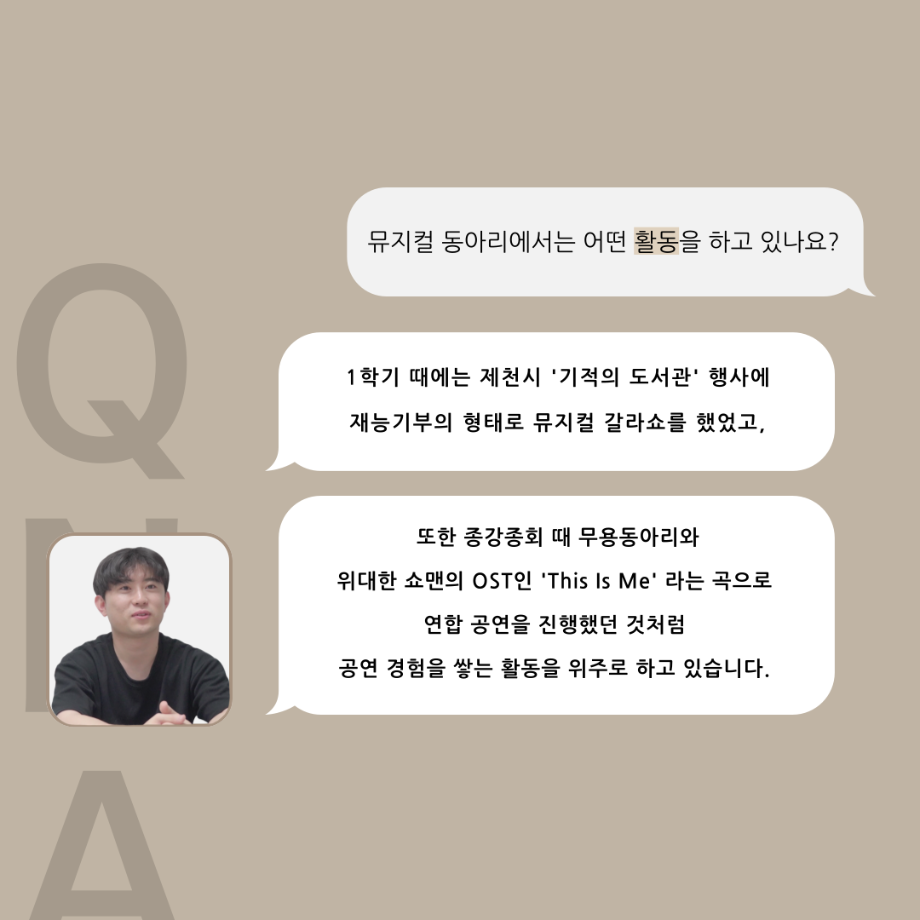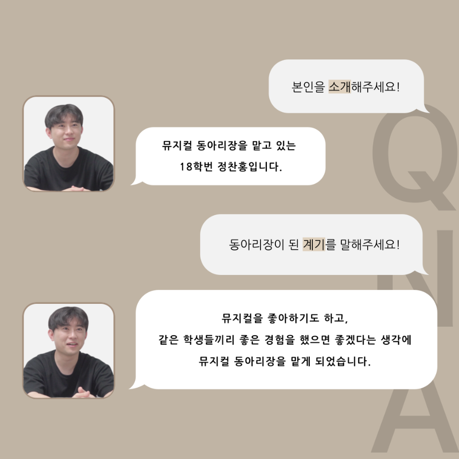 본문 시작 홈으로 커뮤니티 학과소개 입학정보 교수소개 학과과정 커뮤니티 공연예매 안내 홈페이지가이드 동아리 공지사항 포토갤러리 작품DB 동아리 학사일정 학생회 뮤지컬 동아리 무용 동아리 뮤지컬 동아리 극장 스탭 동아리 배우 훈련 동아리 뮤지컬 동아리 페이스북 트위터 프린트 '품'위있는 인’터뷰‘ - 24년도 뮤지컬동아리장 <정찬홍> 연기예술학과 2895 2024-07-31 안녕하십니까. 24년도 학회 ‘품‘ 입니다. 학회 ‘품’의 여덟 번째 인터뷰로 세명대학교 연기예술학과 24학년도 뮤지컬동아리장인 정찬홍 학우와 인터뷰 하는 시간을 가졌습니다. 뮤지컬 동아리장이 된 계기와 동아리에서는 어떤 활동을 하고있는지, 앞으로의 계획은 무엇으며 동아리 부원들에게 전하고 싶은 말 등을 질문하는 시간을 가졌습니다. 앞으로 있을 인터뷰 컨텐츠인 ‘품터뷰’ 많은 사랑 부탁드립니다. 목록 이전🎼 뮤지컬 동아리 “기적의 도서관” 갈라쇼 다음 2024학년도 2학기 뮤지컬 동아리 '음악;音樂' 활동 만족도조사 만족도 조사 이 페이지에서 제공하는 정보에 대하여 만족하시나요? 매우만족 만족 보통 불만족 매우불만족