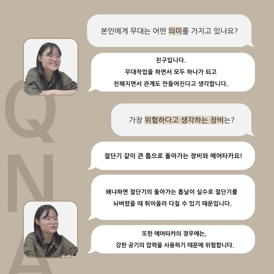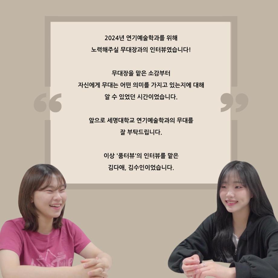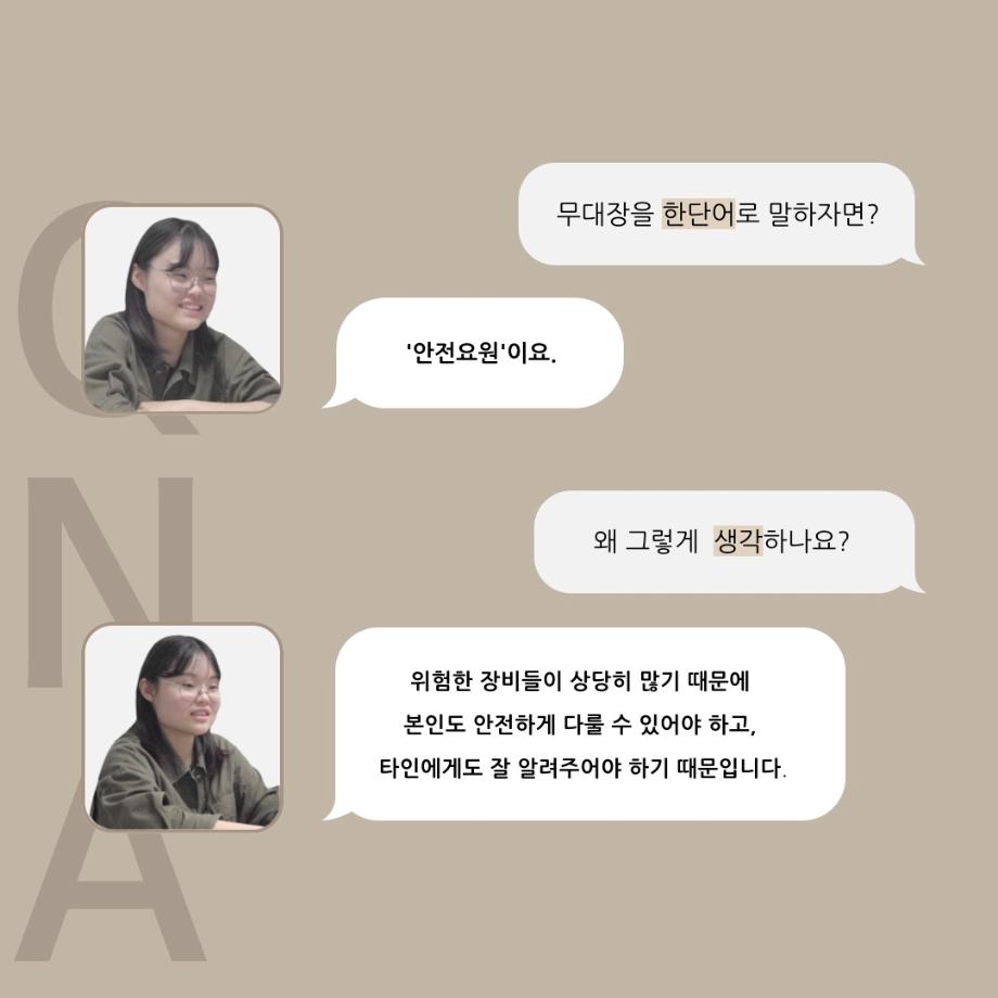 본문 시작 홈으로 커뮤니티 학과소개 입학정보 교수소개 학과과정 커뮤니티 공연예매 안내 홈페이지가이드 동아리 공지사항 포토갤러리 작품DB 동아리 학사일정 학생회 극장 스탭 동아리 무용 동아리 뮤지컬 동아리 극장 스탭 동아리 배우 훈련 동아리 극장 스탭 동아리 페이스북 트위터 프린트 ’품‘위있는 인’터뷰‘ - 24년도 무대장 <장보배> 연기예술학과 2502 2024-07-16 안녕하십니까. 24년도 학회 ‘품‘ 입니다. 학회 ‘품’의 네 번째 인터뷰로 세명대학교 연기예술학과 24학년도 무대장인 장보배 학우와 인터뷰 하는 시간을 가졌습니다. 무대장을 맡게된 소감과 무대는 어떤 의미가 있는지, 위험한 장비는 무엇이며 극장장과 학과생에게 전하고 싶은 말 등을 질문하는 시간을 가졌습니다. 앞으로 있을 인터뷰 컨텐츠인 ‘품터뷰’ 많은 사랑 부탁드립니다. 목록 이전’품‘위있는 인’터뷰‘ - 24년도 극장장 <이종화> 다음 ’품‘위있는 인’터뷰‘ - 24년도 조명장 <오승아> 만족도조사 만족도 조사 이 페이지에서 제공하는 정보에 대하여 만족하시나요? 매우만족 만족 보통 불만족 매우불만족