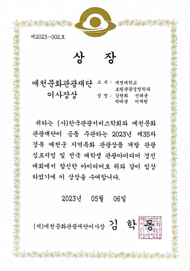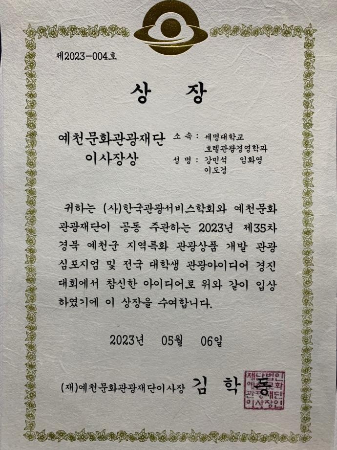 본문 시작 홈으로 커뮤니티 커뮤니티 학과소개 교육 홈페이지가이드 학과동아리 공지사항 학생회활동 학과동아리 취업정보 Idea Bank Idea Bank SOW 빵실빵실 쉐이커스 Idea Bank 페이스북 트위터 프린트 2023년 1학기 공모전 수상 호텔경영학과 2463 2023-05-15 2023년 1학기 공모전 수상 목록 이전2023년 1학기 동아리 활동사진 다음 2023년 2학기 동아리 활동 1 만족도조사 만족도 조사 이 페이지에서 제공하는 정보에 대하여 만족하시나요? 매우만족 만족 보통 불만족 매우불만족