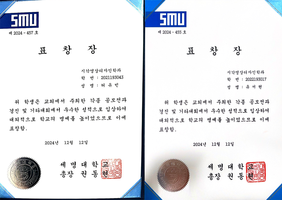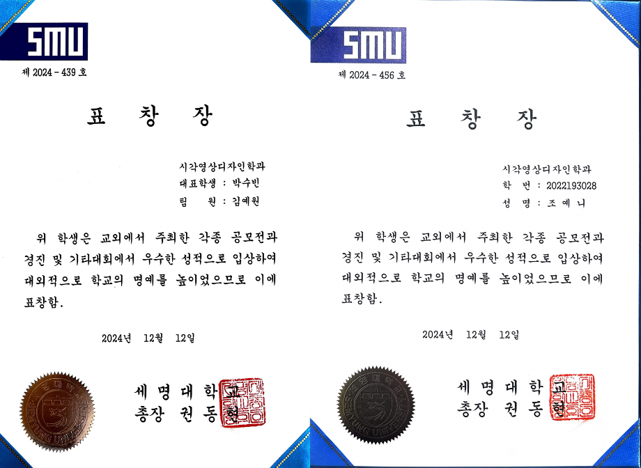 본문 시작 홈으로 시영소식 학과소개 학과과정 시영소식 입학/취업 AI 학과자랑 SNS소통 홈페이지가이드 학과행사 공지사항 학과행사 공모전 학생 인터뷰 학과행사 페이스북 트위터 프린트 2024학년도 2학기 총장표창 수여식 시각영상디자인학과 1830 2024-12-20 우리학과에서 5명이 대외수상 분야로 수상하였습니다 축하합니다~ 4학년 - 김예원, 허유빈, 박수빈 3학년 - 조예니, 유서현 목록 이전세명고 전공체험(12.18.수) 다음 AI 콘텐츠연구소 전시 안내 담당부서 : 시각영상디자인학과 담당자 : - 연락처 : 043-649-1726 최종수정일 : 2024-10-26 만족도조사 만족도 조사 이 페이지에서 제공하는 정보에 대하여 만족하시나요? 매우만족 만족 보통 불만족 매우불만족