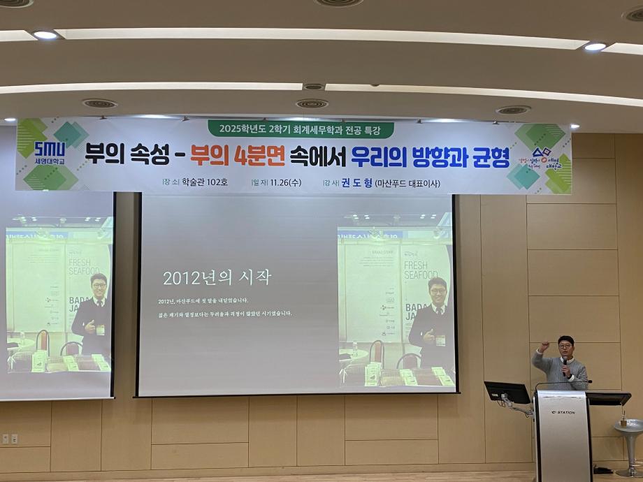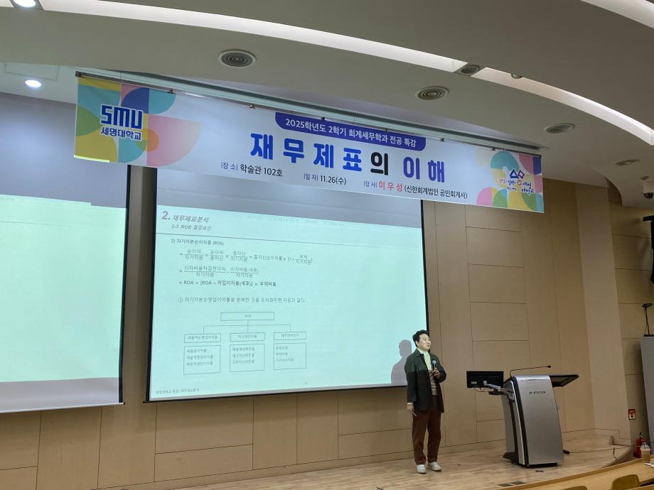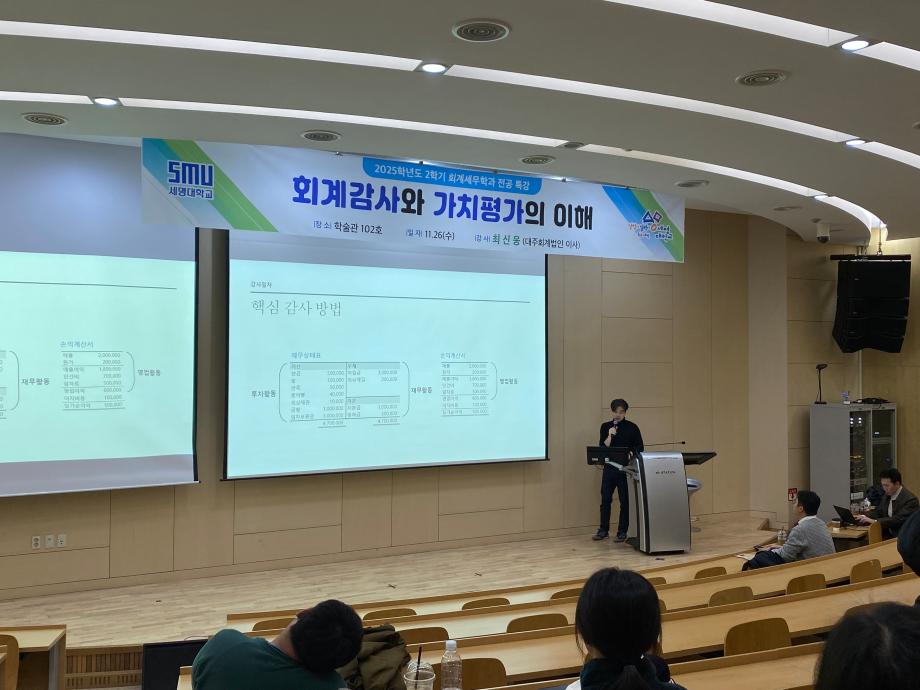 본문 시작 홈으로 학과소식 학과소개 취업정보 교육과정 학과소식 홈페이지가이드 학과행사 공지사항 포토갤러리 학과이야기 학과행사 학과행사 페이스북 트위터 프린트 2025학년도 2학기 회계세무학과 전공특강 회계세무금융학과 316 2025-11-27 2025학년도 2학기 회계세무학과 전공특강을 진행하였습니다~! 목록 이전2025학년도 2학기 회계세무학과 전문가 특강 다음 회계세무학과 종강총회 만족도조사 만족도 조사 이 페이지에서 제공하는 정보에 대하여 만족하시나요? 매우만족 만족 보통 불만족 매우불만족