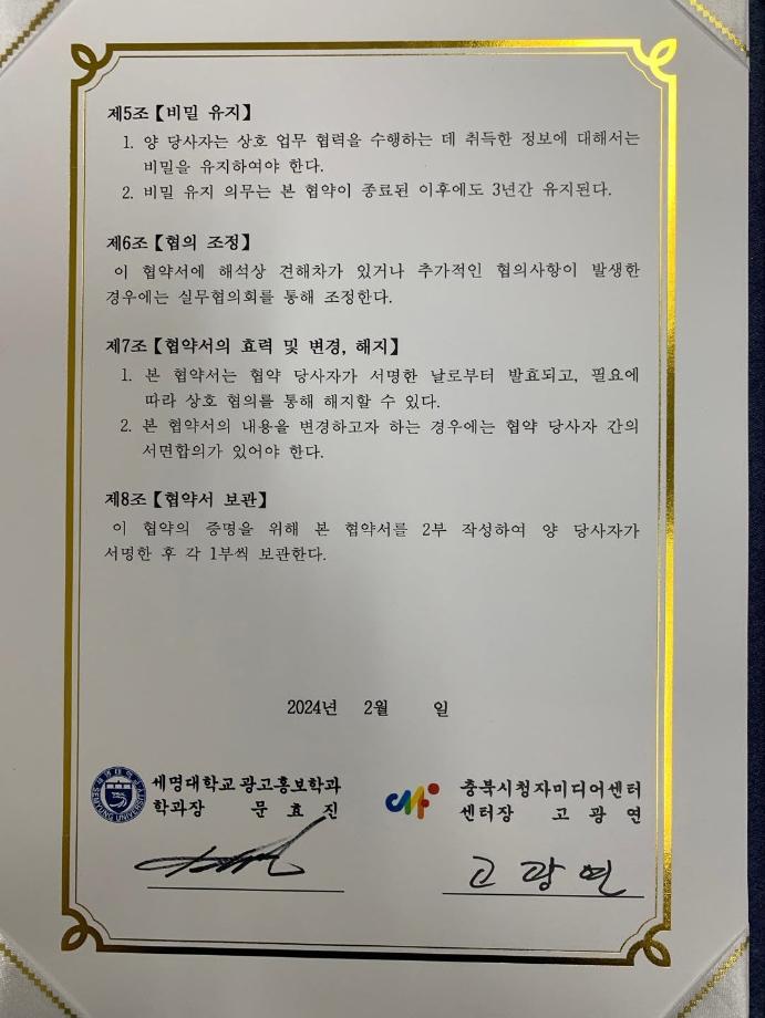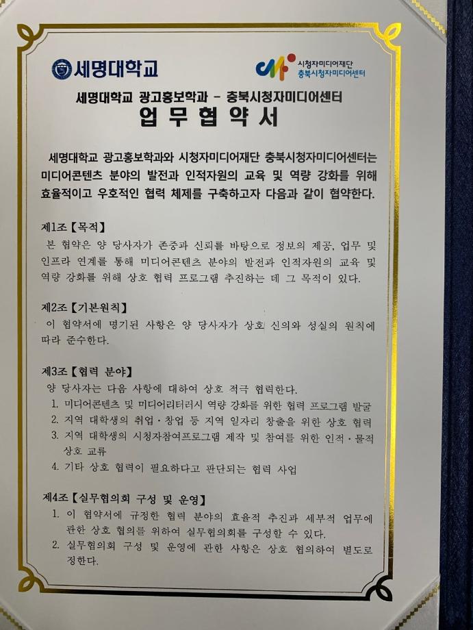 본문 시작 홈으로 매력적인 학과소개 매력적인 학과소개 흥미로운 교육과정 특별CC프로그램 We can 취업 따뜻한 커뮤니티 홈페이지가이드 지금 우리 광홍은 학과개요 학과연혁 교수소개 Wilco로 보는광고홍보학과 지금 우리 광홍은 지금 우리 광홍은 페이스북 트위터 프린트 [충북시청자미디어센터-세명대광고홍보학과] 업무협약 체결 광고홍보학과 3226 2024-07-17 <충북시청자미디어센터>와 <세명대 광고홍보학과> 업무협약식 개최 지역 미디어 콘텐츠 분야의 발전과 광고홍보 전문인력양성지원을 위해 큰 우군을 얻었습니다. ^^ '세명대 광고홍보학과'는 광고와 다양한 콘텐츠를 위한 [기획 맛집]을 넘어 [영상제작 맛집]을 향해 갑니다. 목록 이전[학과홍보]지금 우리 광홍은! 다음 [공동교육과정]단양/제천 소재 고교생 대상 광고/마케팅 특강