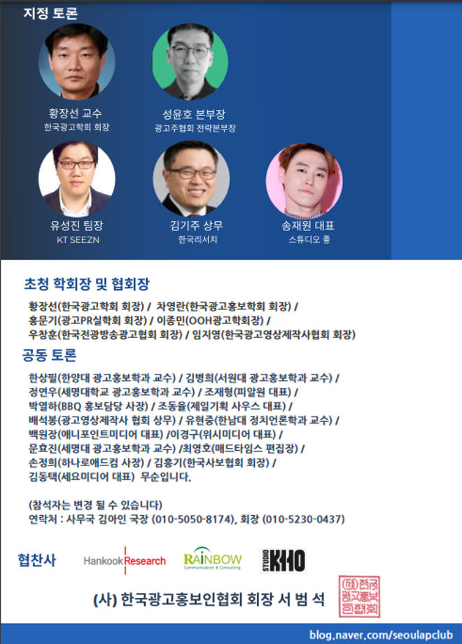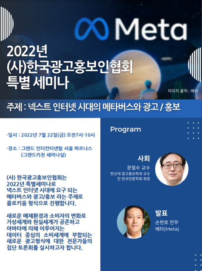본문 시작 홈으로 매력적인 학과소개 매력적인 학과소개 흥미로운 교육과정 특별CC프로그램 We can 취업 따뜻한 커뮤니티 홈페이지가이드 지금 우리 광홍은 학과개요 학과연혁 교수소개 Wilco로 보는광고홍보학과 지금 우리 광홍은 지금 우리 광홍은 페이스북 트위터 프린트 특별 세미나_넥스트 인터넷 시대의 메타버스와광고/홍보 광고홍보학과 4471 2022-09-16 우리 광홍과 교수님들은 열공중! 특별 세미나 참석. - 주최 : (사) 한국광고홍보인협회 - 주제 : 넥스트 인터넷 시대의 메타버스와 광고/홍보 - 발표 : 손현호 전무님(Meta). Meta는 Facebook의 변경된 사명임 - 참석 : 서범석 교수님(주최자), 정연우 교수님(토론자), 문효진 교수님(토론자) * 행사를 주최한 (사)한국광고홍보인협회 회장님은 우리 광홍과 서범석 교수님이십니다. ^^ 목록 이전2022년도 광고홍보 취업 특강 시리즈 1탄 다음 대한민국 대학생 광고대회 대전/충청권 1위