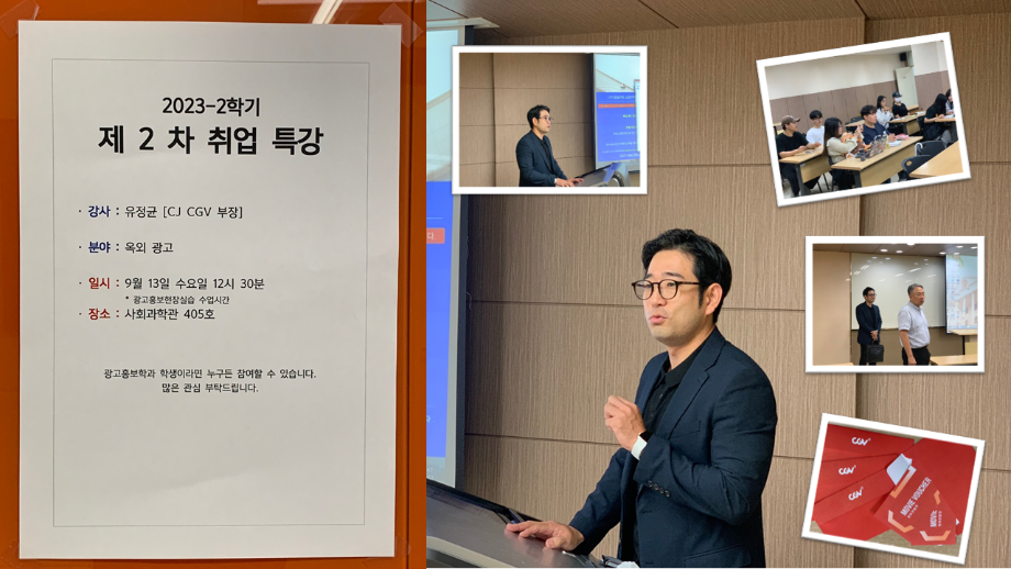 본문 시작 홈으로 매력적인 학과소개 매력적인 학과소개 흥미로운 교육과정 특별CC프로그램 We can 취업 따뜻한 커뮤니티 홈페이지가이드 지금 우리 광홍은 학과개요 학과연혁 교수소개 Wilco로 보는광고홍보학과 지금 우리 광홍은 지금 우리 광홍은 페이스북 트위터 프린트 [취업특강2탄] 광고홍보학과 5305 2023-09-14 23학년도 2학기 취업특강 제2탄 디지털OOH 'CJ CGV' _일시 : 2023년 9월 13일(수), 12:30~ _장소 : 사회과학관 405호 _내용 : 디지털OOH 산업계 현황 및 취업 노하우 _강사 : CJ CGV 유정균 부장 * 특강 후 1:1 취업 면담도 진행했습니다. 그리고 CGV 영화 티겟도 선물로 받았습니다. ^^ 옥외광고 분야 취업을 희망하는 학생은 추후라도 연락주시면 취업을 돕겠습니다. : ) 목록 이전[취업특강1탄] 다음 [애드아시아]국제광고행사참가