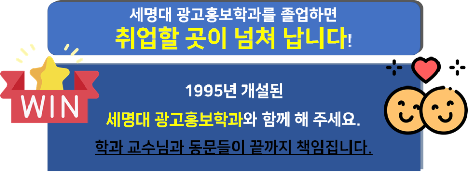 본문 시작 홈으로 매력적인 학과소개 매력적인 학과소개 흥미로운 교육과정 특별CC프로그램 We can 취업 따뜻한 커뮤니티 홈페이지가이드 지금 우리 광홍은 학과개요 학과연혁 교수소개 Wilco로 보는광고홍보학과 지금 우리 광홍은 지금 우리 광홍은 페이스북 트위터 프린트 [취업현황]우리 광홍 취업은 광고홍보학과 3526 2024-09-13 우리 광홍은 취업률이 좋습니다. 최근 취업률이 70% 이상을 기록하고 있습니다. * 1995년 개설된 '역사'와 '전통', '역량'을 가진 우리 광홍 여러분의 취업과 성공을 학과는 기도하고 돕겠습니다. "기획맛집" 세명대 광고홍보학과!! 기획력이 경쟁력이다~. 목록 이전[수상]2024코삭챌린저상 다음 [경축]2025대한민국 대학생 광고대회 '최우수상'수상_대전충청지역대회