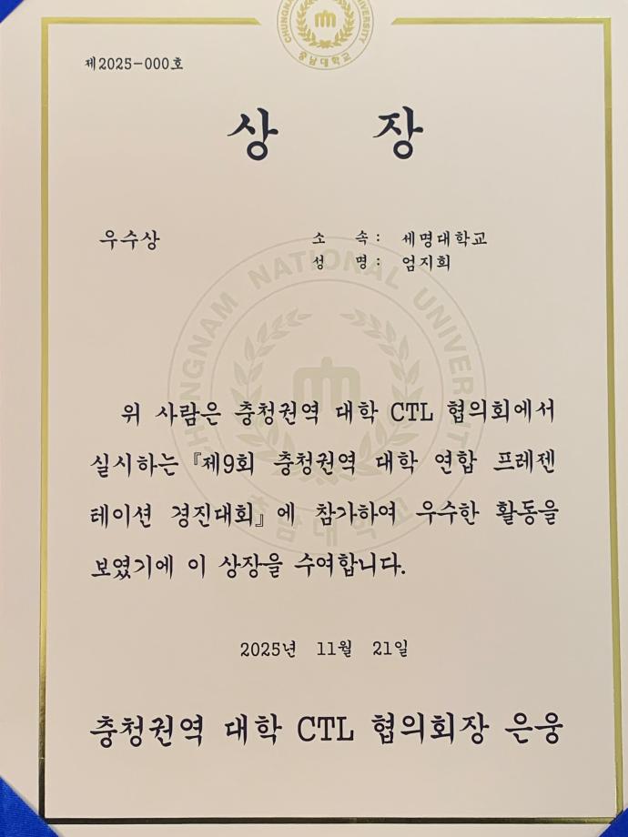 본문 시작 홈으로 매력적인 학과소개 매력적인 학과소개 흥미로운 교육과정 특별CC프로그램 We can 취업 따뜻한 커뮤니티 홈페이지가이드 지금 우리 광홍은 학과개요 학과연혁 교수소개 Wilco로 보는광고홍보학과 지금 우리 광홍은 지금 우리 광홍은 페이스북 트위터 프린트 25학번 엄지희_충청권역 대학 연합 프레젠테이션_우수상 광고홍보학과 1011 2025-11-24 우리 광고홍보학과 25학번 엄지희 학생이 '제9회 충청권역 대학 연합 프레젠테이션 경진대회'에서 우수상을 수상했어요. ^^ 훌륭하고, 대견합니다. 진심으로 축하합니다. '기획 맛집' 세명대 광고홍보학과!!! '발표 맛집' 까지... 목록 이전2025-2학기 개강총회 다음 새해 복 많이 받으세요 : )
