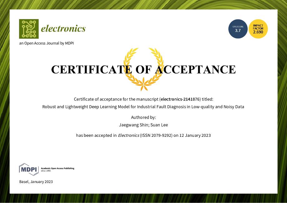 세명대학교(총장 권동현)는 컴퓨터학부 4학년에 재학중인 신재광씨가 제1저자로, 컴퓨터학부 이수안 교수가 교신저자로 참여하여 ‘Robust and Lightweight Deep Learning Model for Industrial Fault Diagnosis in Low-Quality and Noisy Data’라는 제목으로 논문을 SCI급 저널 Electronics의 Special Issue "Application Research Using AI, IoT, HCI, and Big Data Technologies"에 게재하였다고 16일 밝혔다.