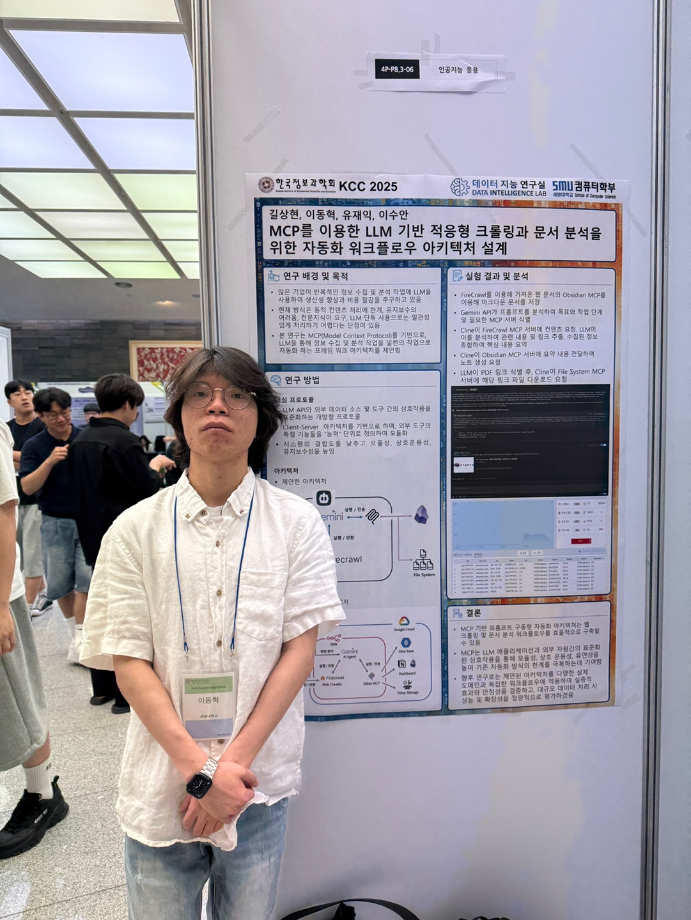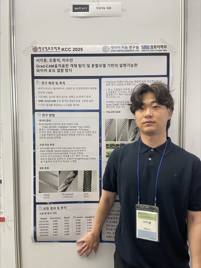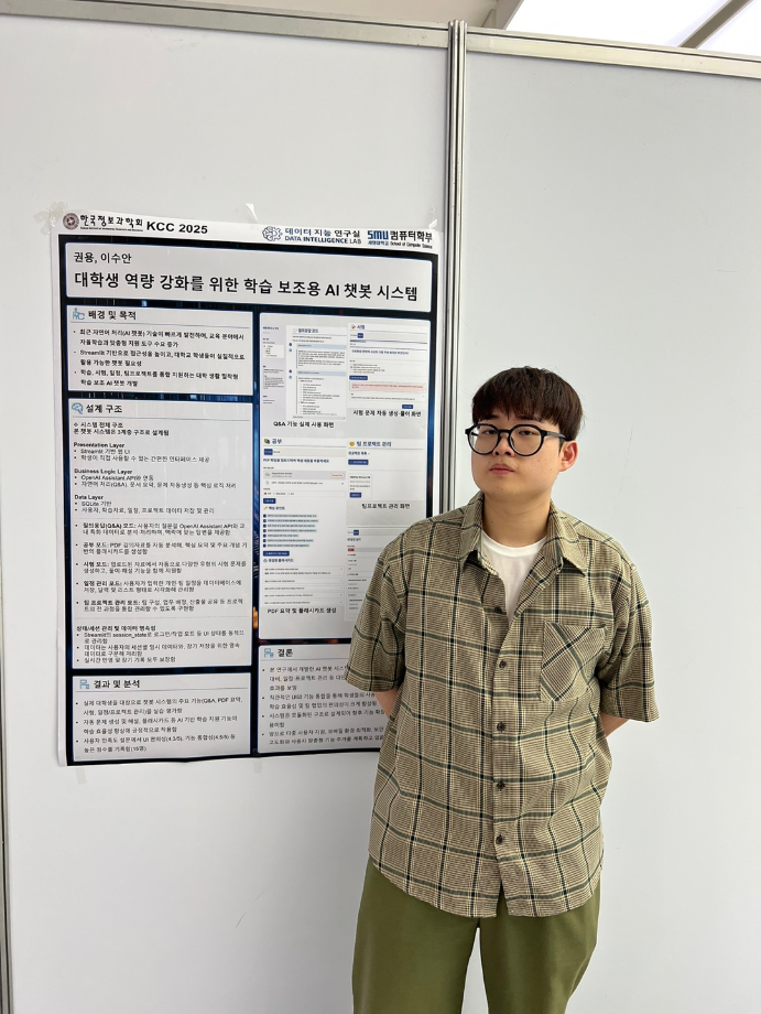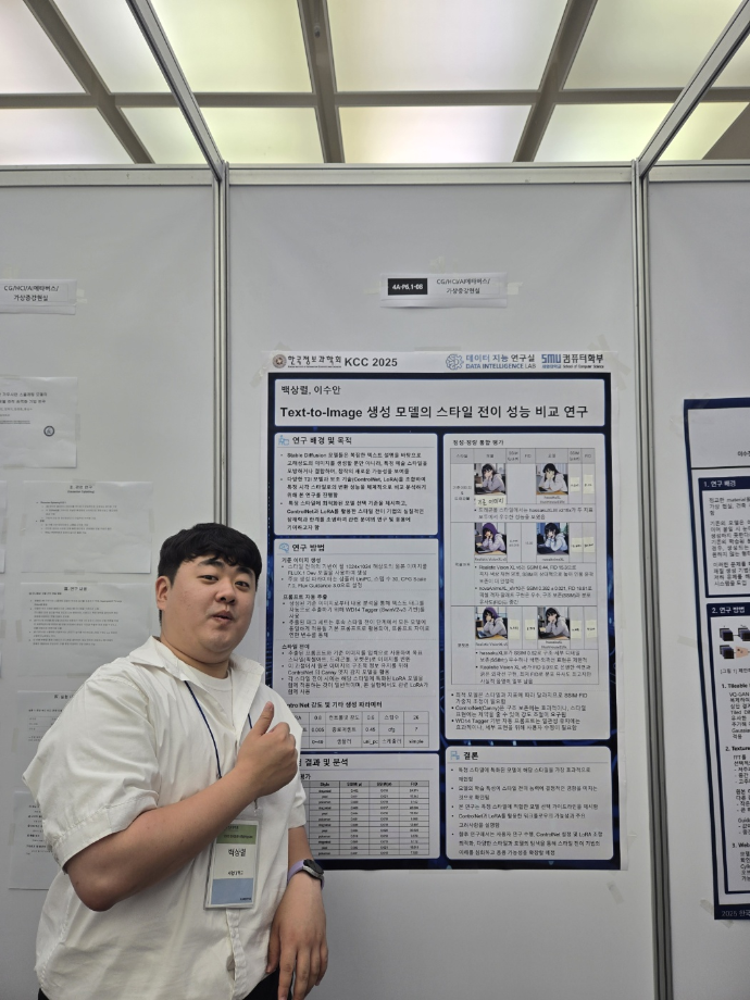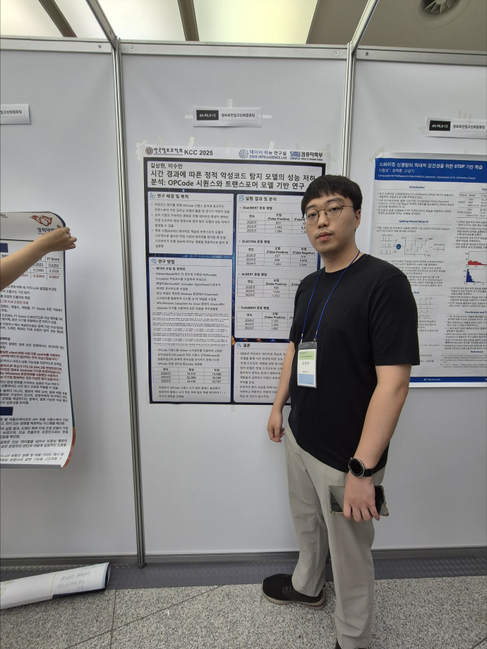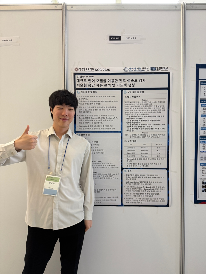 본문 시작 홈으로 학부활동 학부소개 학부활동 교육과정 커뮤니티 학부생활 입학안내 홈페이지가이드 학부행사 학부행사 학생회 활동 전공 동아리 학부갤러리 학부행사 페이스북 트위터 프린트 2025 한국컴퓨터종합학술대회 논문 발표 참가 - 1 컴퓨터학부 773 2025-07-09 국내 컴퓨터분야 최대 학술대회인 2025 한국컴퓨터종합학술대회 논문 발표에 참여한 고상근, 권용, 길상현, 김남현, 김동후, 김병학, 김재성, 박주성, 백상렬, 서지훈, 우강석, 이동혁 학생입니다. 모두 고생하셨습니다! 목록 이전세명대학교 컴퓨터학부 2025-1학기 단체봉사 다음 2025 한국컴퓨터종합학술대회 논문 발표 참가 - 2 만족도조사 만족도 조사 이 페이지에서 제공하는 정보에 대하여 만족하시나요? 매우만족 만족 보통 불만족 매우불만족