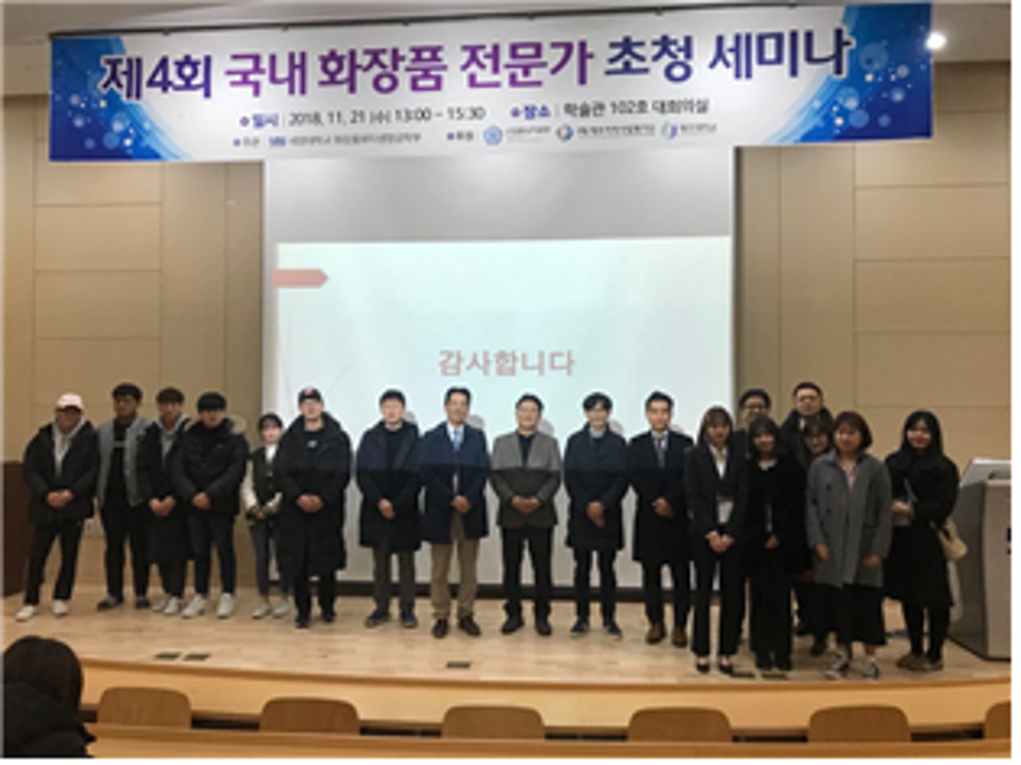 세명대학교 화장품뷰티생명공학부가 주관한 제4차 국내화장품 전문가 초청 세미나가 11.21(수) 세명대 학술관 102호에서 성황리에 개최되었다. 제주-충북-충남-전북을 중심으로 한 경제협력권 화장품산업 활성화를 위해 매년 세명대학교 화장품뷰티생명공학부에서 개최하는 본 세미나는 올해 4회 째를 맞이하고 있다. 특히 이번 세미나에서는 (주)ACT 박시준 박사, 전 (주)에이블씨앤씨 정필회 이사, (주)뉴클릭스바이오 김도형 박사를 외부 초청연자로 모시고 경제협력권 화장품산업에 대한 전반적인 소개 뿐 아니라 화장품 산업의 직무별 포지셔닝과 역할, 화장품 브랜드 매니저 및 상품기획, 기능성화장품과 신약개발의 연구전략등의 내용으로 꾸며졌다. 외부기업 및 화장품뷰티생명공학부 학생들이 참여하여 화장품 산업 전반에 걸친 현황 및 비전을 공유하는 의미있는 시간이 되었다.