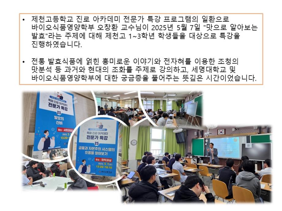 본문 시작 홈으로 학부소개 학부소개 진로·취업 교육과정 커뮤니티 대학원 입학상담 홈페이지가이드 갤러리 학부비전 학부장 인사말 학부연혁 학부장점 교수소개 교육시설 MOU 체결 갤러리 갤러리 페이스북 트위터 프린트 20250507 제천고 진로아카데미전문가특강(오창환교수님) 바이오식품영양학부 538 2025-06-10 목록 다음 2025년 1학기 바이오캡스톤디자인 다음 2025학년도 학부역량강화사업 "식품산업기사(작업형) 교육" 만족도조사 만족도 조사 이 페이지에서 제공하는 정보에 대하여 만족하시나요? 매우만족 만족 보통 불만족 매우불만족