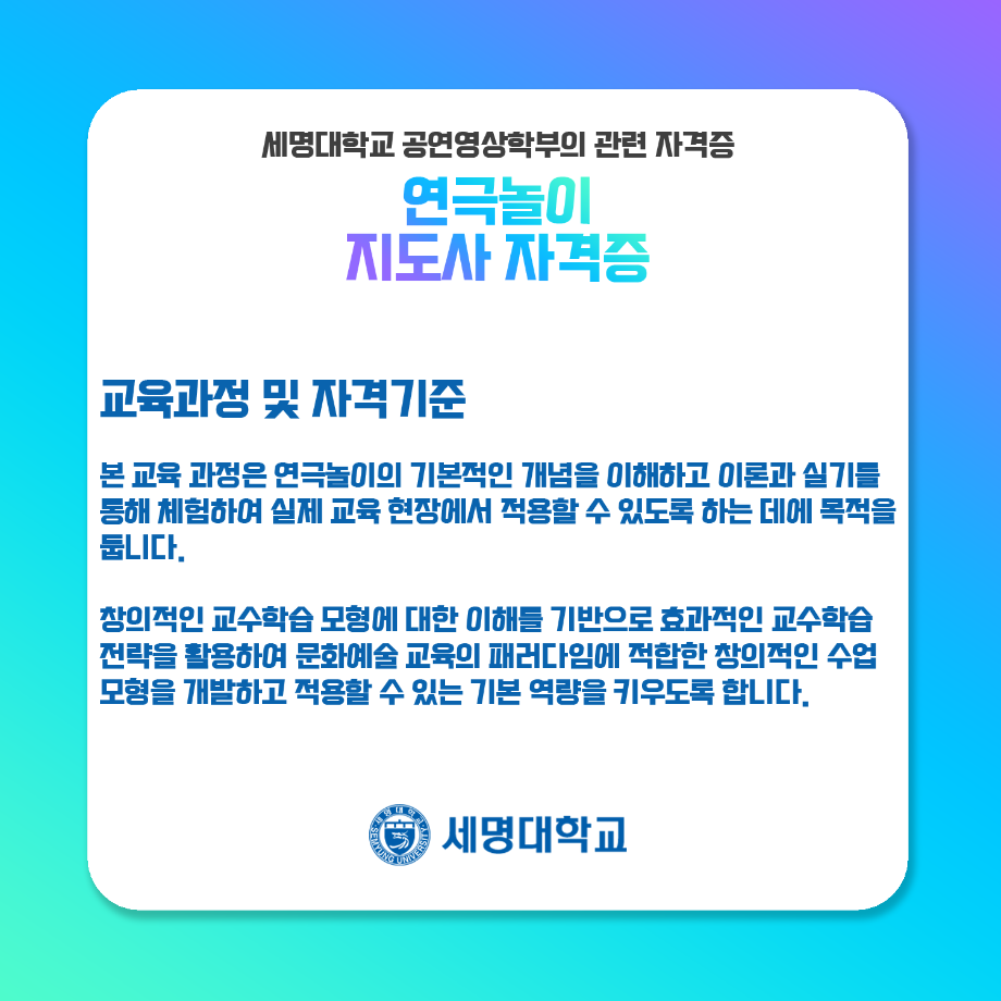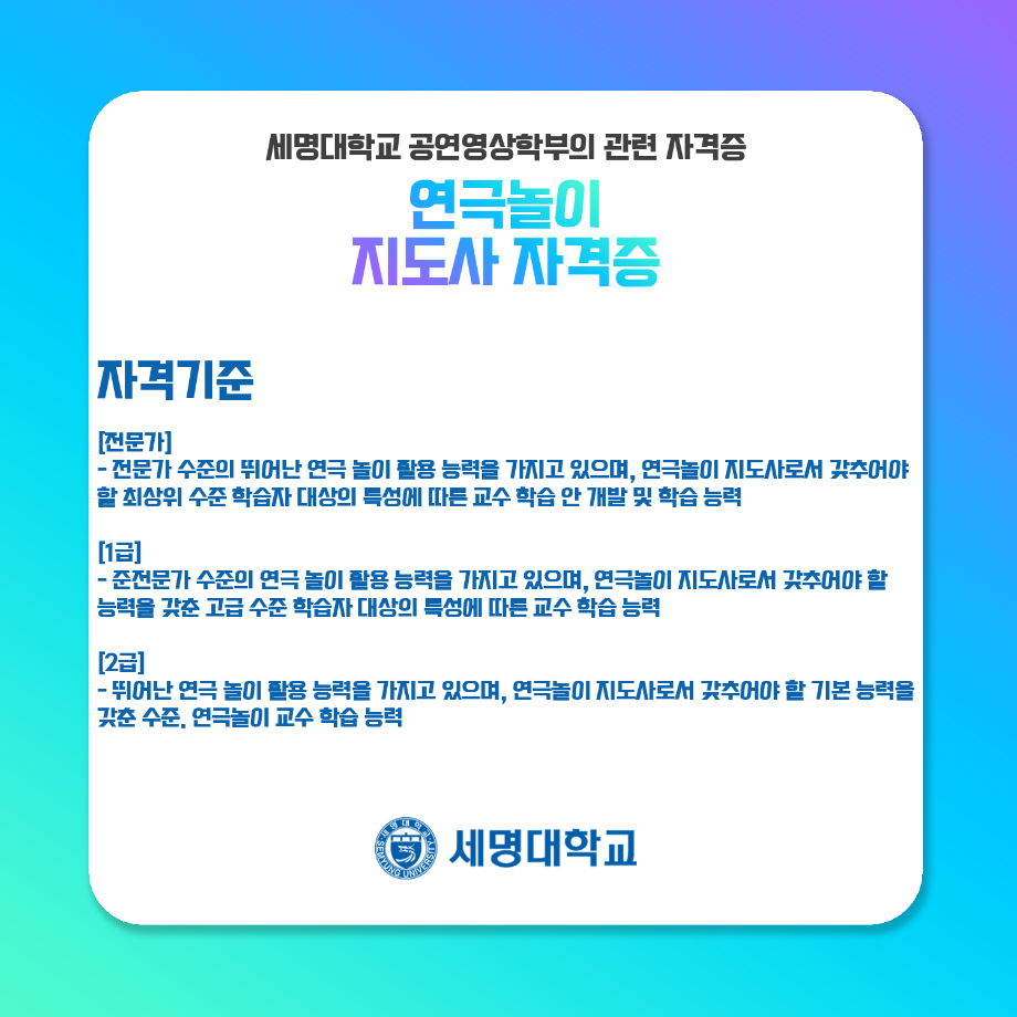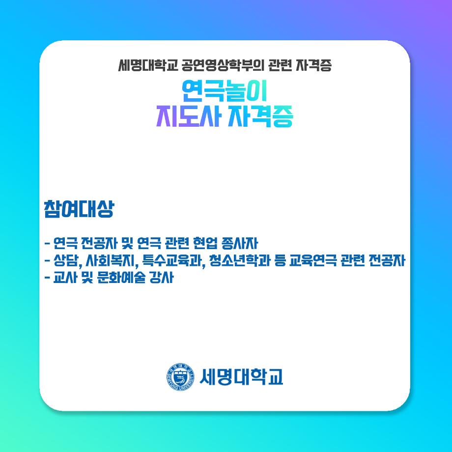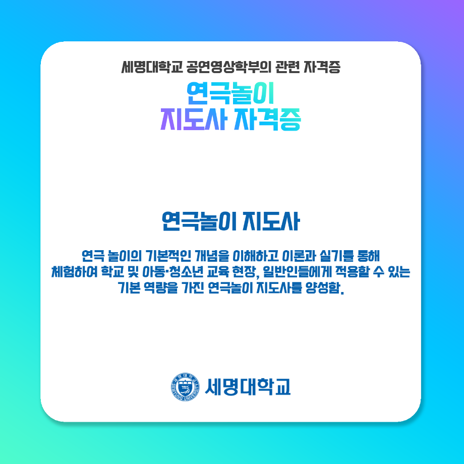 본문 시작 홈으로 학과과정 학과소개 입학정보 교수소개 학과과정 커뮤니티 공연예매 안내 홈페이지가이드 비교과프로그램 교육과정 전공교육 체계도 비교과프로그램 MOU 체결 연극놀이 지도사 양성 교육 하계, 동계 프로젝트 연극놀이 지도사 양성 교육 현장실습 프로그램 액팅플러스 연극놀이 지도사 양성 교육 페이스북 트위터 프린트 연극놀이 지도사 자격증 연기예술학과 4547 2022-01-15 세명대학교 연기예술학과에서는 학과생들을 위하여 매년 연극놀이지도사 자격증 취득을 위한 교육을 지원하고 있습니다. ㅤㅤ 한국임상연극심리치료협회의 지도하에 많은 학생들이 교육 과정을 이수하여 100%의 합격률을 자랑하고 있는 연극놀이지도사 자격증에 대하여 알려드립니다! 목록 다음 무대예술 전문인 자격증 만족도조사 만족도 조사 이 페이지에서 제공하는 정보에 대하여 만족하시나요? 매우만족 만족 보통 불만족 매우불만족