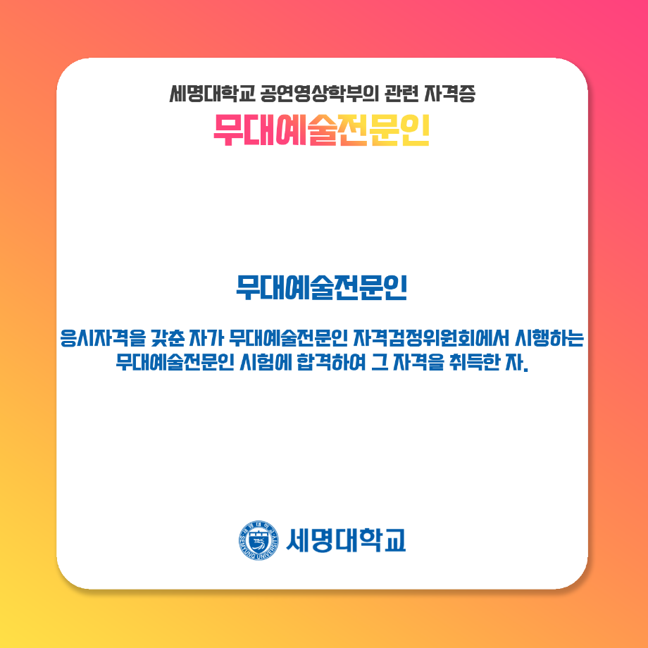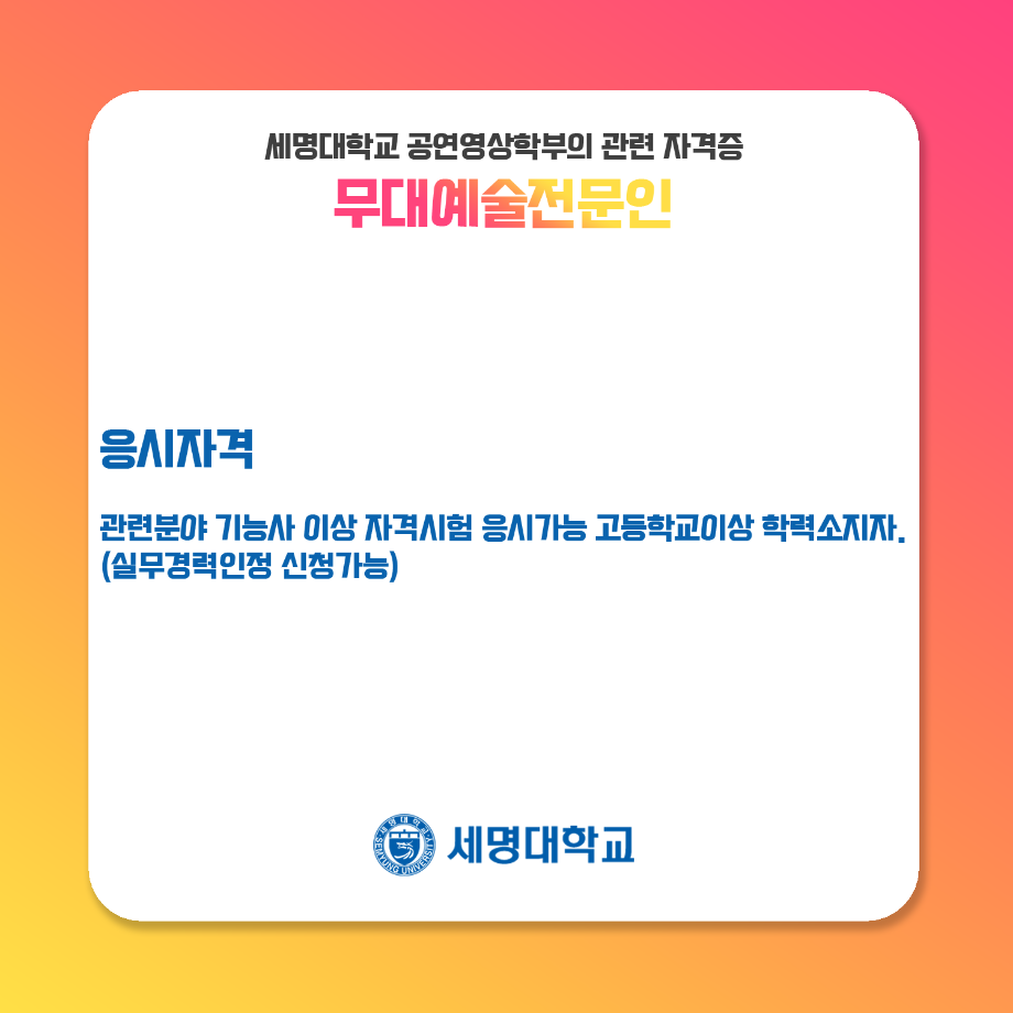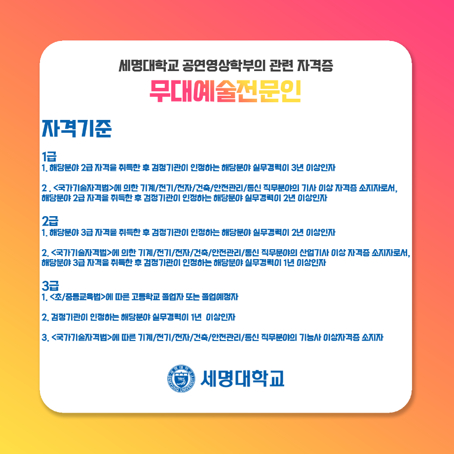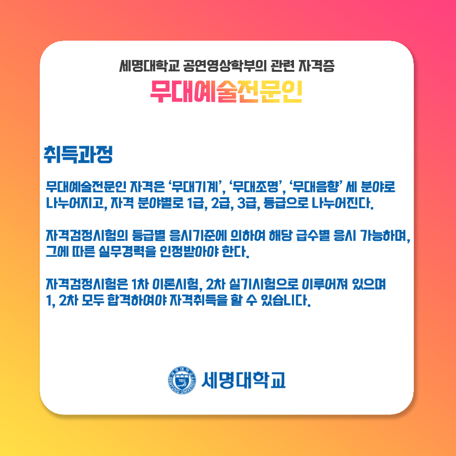 본문 시작 홈으로 학과과정 학과소개 입학정보 교수소개 학과과정 커뮤니티 공연예매 안내 홈페이지가이드 비교과프로그램 교육과정 전공교육 체계도 비교과프로그램 MOU 체결 연극놀이 지도사 양성 교육 하계, 동계 프로젝트 연극놀이 지도사 양성 교육 현장실습 프로그램 액팅플러스 연극놀이 지도사 양성 교육 페이스북 트위터 프린트 무대예술 전문인 자격증 연기예술학과 4277 2022-01-16 세명대학교 연기예술학과에서는 학과생을 위하여 매년 무대예술전문인 자격증 취득을 위한 교육을 지원하고 있습니다. ㅤㅤ 제 1전공뿐만이 아닌 학부와 관련된 다양한 전공을 경험하면서 스탭 분야별(무대, 조명, 음향)로 전공 지식을 함양함과 동시에 초대 강사님들의 지도하에 많은 학생들이 교육 과정을 이수하고 있습니다! 목록 이전연극놀이 지도사 자격증 이전연극놀이 지도사 양성 교육 1일차 활동 사진 만족도조사 만족도 조사 이 페이지에서 제공하는 정보에 대하여 만족하시나요? 매우만족 만족 보통 불만족 매우불만족