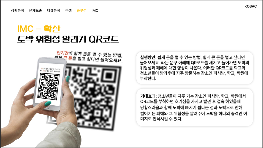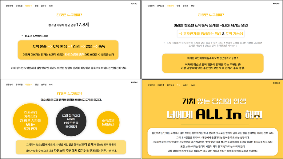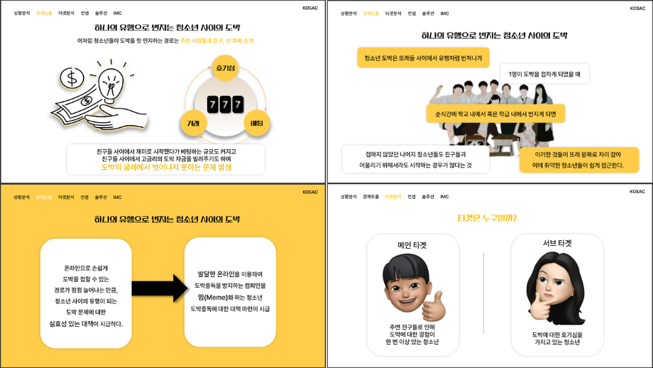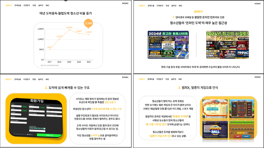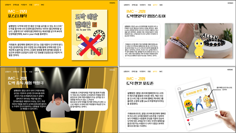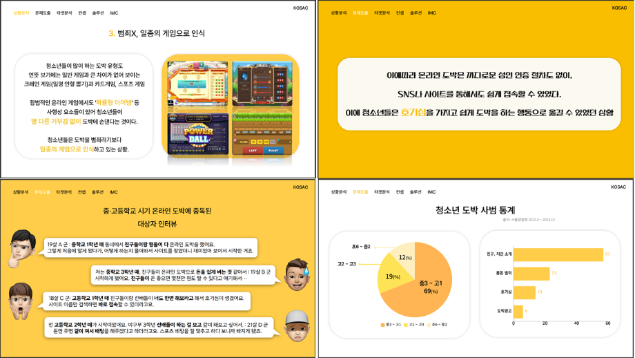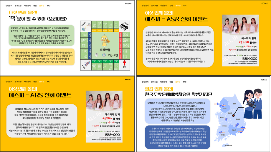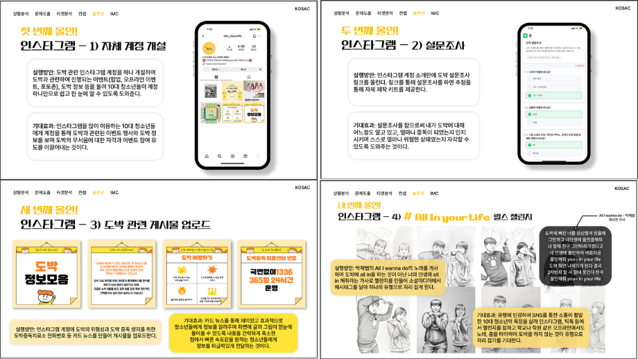 본문 시작 홈으로 흥미로운 교육과정 매력적인 학과소개 흥미로운 교육과정 특별CC프로그램 We can 취업 따뜻한 커뮤니티 홈페이지가이드 작품 갤러리 교육일정 교육과정 전공교육 체계도 졸업후진로 작품 갤러리 작품 갤러리 페이스북 트위터 프린트 [2024KOSAC]대한민국대학생광고대회 출품작 광고홍보학과 3804 2024-09-09 2024년도 대한민국 대학생 광고대회 출품작 주제 : 청소년 도박중독 방지를 위한 국민 참여 캠페인 제안서 세명대 광고홍보학과는 '기획맛집'을 지향하고, 이를 인정받고 있습니다 : ) 목록 이전[사회과학조사방법론]키오스경험인식조사 다음 [2024KOSAC]대한민국대학생광고대회 출품작