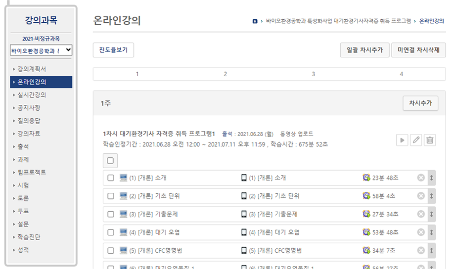 본문 시작 홈으로 학과과정 학과소개 교수소개 학과과정 커뮤니티 홈페이지가이드 비교과프로그램 교육과정 전공교육 체계도 졸업요건 비교과프로그램 특성화 환경기사자격증 취득 특성화 환경기사자격증 취득 환경기사자격증 멘토링 시스템 환경기사자격증 단기실무 학과 특성화 포인트 제도 대학혁신지원Creative Cube 특성화 환경기사자격증 취득 페이스북 트위터 프린트 2021학년도 특성화 환경기사 자격증 취득 프로그램 시행 바이오환경공학과 3586 2022-01-26 2021학년도 특성화 환경기사 자격증 취득 프로그램을 하계 방학동안 비대면으로 실시하였습니다. 본 프로그램을 통해 재학생들이 환경기사 자격증을 취득하며 진로 의사결정에 도움이 되었으면 좋겠습니다! 다음 학년도에도 많은 관심과 참여 해주시고 자격증 취득을 기원합니다! 목록 이전특성화 환경기사 자격증 프로그램 담당부서 : 환경에너지학과 담당자 : - 연락처 : 043-649-1337 최종수정일 : 2024-10-26 만족도조사 만족도 조사 이 페이지에서 제공하는 정보에 대하여 만족하시나요? 매우만족 만족 보통 불만족 매우불만족
