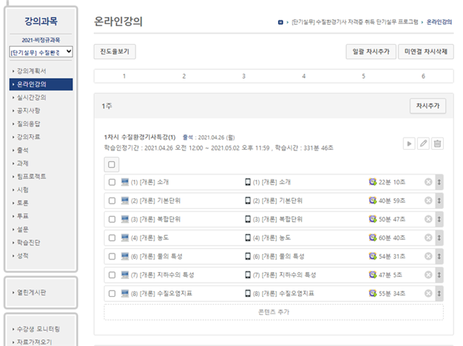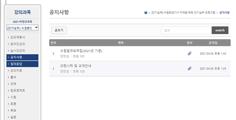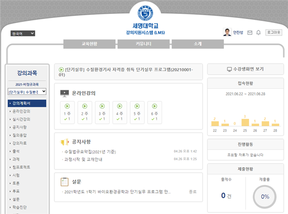 비대면으로 인한 LMS(온라인강의시스템)강의로 진행되었습니다.