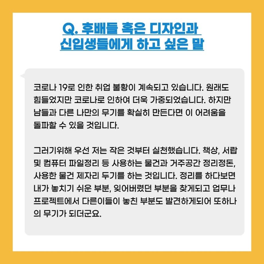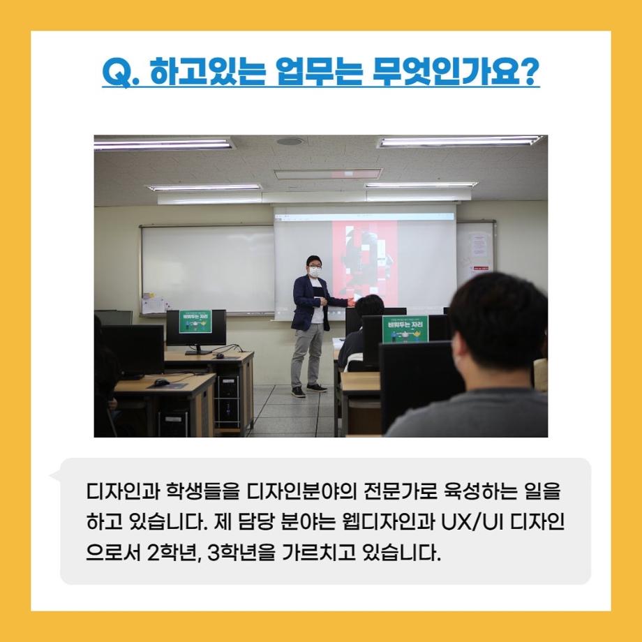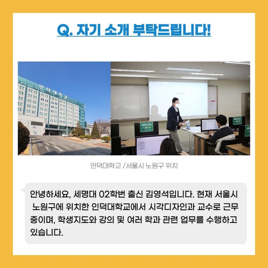 본문 시작 홈으로 입학/취업 학과소개 학과과정 시영소식 입학/취업 AI 학과자랑 SNS소통 홈페이지가이드 취업지금 입학여기 취업지금 전공소개 취업지금 페이스북 트위터 프린트 자랑스럽고 빛나는 선배들 2탄! 시각영상디자인학과 2545 2022-02-07 목록 이전자랑스럽고 빛나는 선배들 1탄! 다음 시디과 졸업 후 어디로 나아갈까? 3 담당부서 : 시각영상디자인학과 담당자 : - 연락처 : 043-649-1726 최종수정일 : 2024-10-26 만족도조사 만족도 조사 이 페이지에서 제공하는 정보에 대하여 만족하시나요? 매우만족 만족 보통 불만족 매우불만족