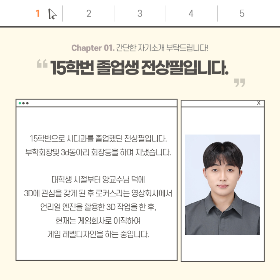 본문 시작 홈으로 입학/취업 학과소개 학과과정 시영소식 입학/취업 AI 학과자랑 SNS소통 홈페이지가이드 취업지금 입학여기 취업지금 전공소개 취업지금 페이스북 트위터 프린트 게임 레벨 디자이너 - 15학번 전상필 졸업생 시각영상디자인학과 2948 2023-07-31 목록 이전취업사례 중 대학원 진학 편 다음 행사대행사 기획자 - 17학번 김슬기 졸업생 담당부서 : 시각영상디자인학과 담당자 : - 연락처 : 043-649-1726 최종수정일 : 2024-10-26 만족도조사 만족도 조사 이 페이지에서 제공하는 정보에 대하여 만족하시나요? 매우만족 만족 보통 불만족 매우불만족