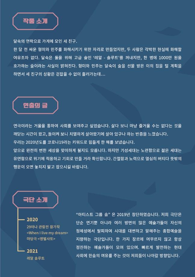 본문 시작 홈으로 학과소개 학과소개 입학정보 교수소개 학과과정 커뮤니티 공연예매 안내 홈페이지가이드 진로 학과개요 학과장인사말 학과연혁 세명대학교 민송아트홀 학과행사 진로 진로 페이스북 트위터 프린트 - 졸업생 창단 극단 ‘아티스트 그룹 숨’ 정기 공연 안내 연기예술학과 2188 2021-04-06 “일어나라, 자본주의의 반항아들아.” 🎓 졸업생 12학번 오기택 선배님이 창단한 [아티스트 그룹 숨] 두 번째 정기 공연작 <레알 솔루트> 🎓 일시 : 2021. 04. 06 (화) - 2021. 04. 18 (일) 목록 다음 졸업생 이현석 배우 국립극단 <무중력 연애 : 낭독 공연> 다음 졸업생 장하다, 극단 늘품의 ‘ 후설’ 무대 특별상 수상 만족도조사 만족도 조사 이 페이지에서 제공하는 정보에 대하여 만족하시나요? 매우만족 만족 보통 불만족 매우불만족