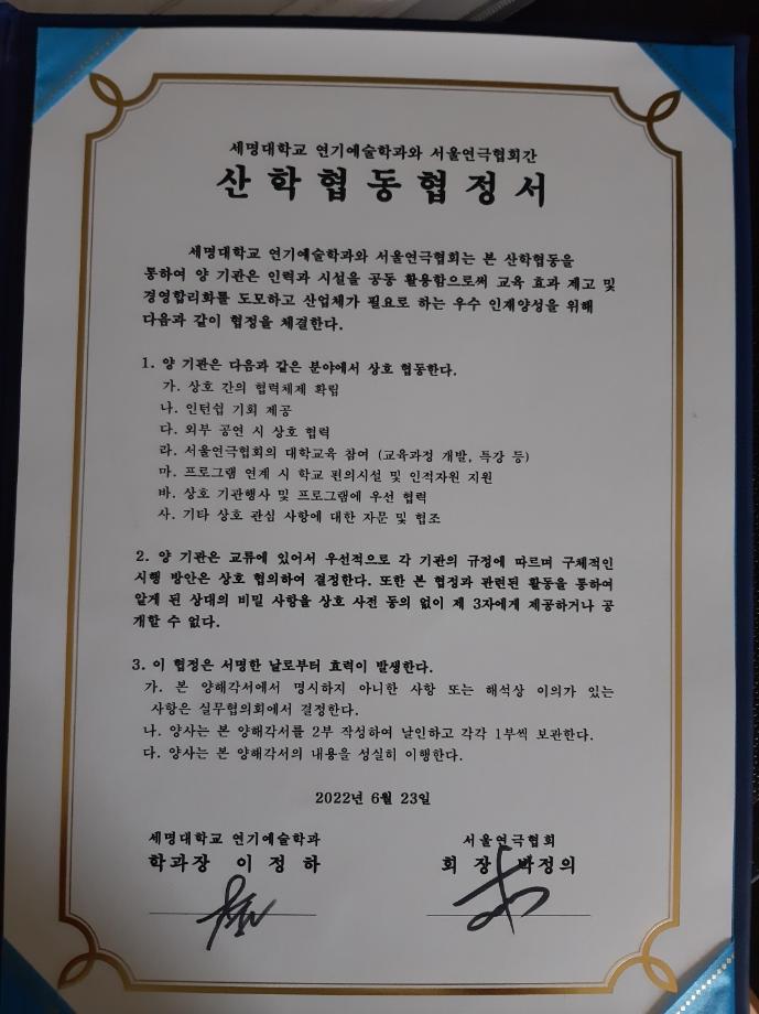본문 시작 홈으로 학과과정 학과소개 입학정보 교수소개 학과과정 커뮤니티 공연예매 안내 홈페이지가이드 MOU 체결 교육과정 전공교육 체계도 비교과프로그램 MOU 체결 MOU 체결 페이스북 트위터 프린트 세명대학교 연기예술학과 서울연극협회 산학 협동 협정서 연기예술학과 3005 2022-07-12 목록 이전세명대학교 (전방송연예학과와) (현 연기예술학과) 극단 이유 산학 협동 협정서 다음 세명대학교 연기예술학과, 극단 명작옥수수밭과 산학협력협약(MOU) 체결 만족도조사 만족도 조사 이 페이지에서 제공하는 정보에 대하여 만족하시나요? 매우만족 만족 보통 불만족 매우불만족