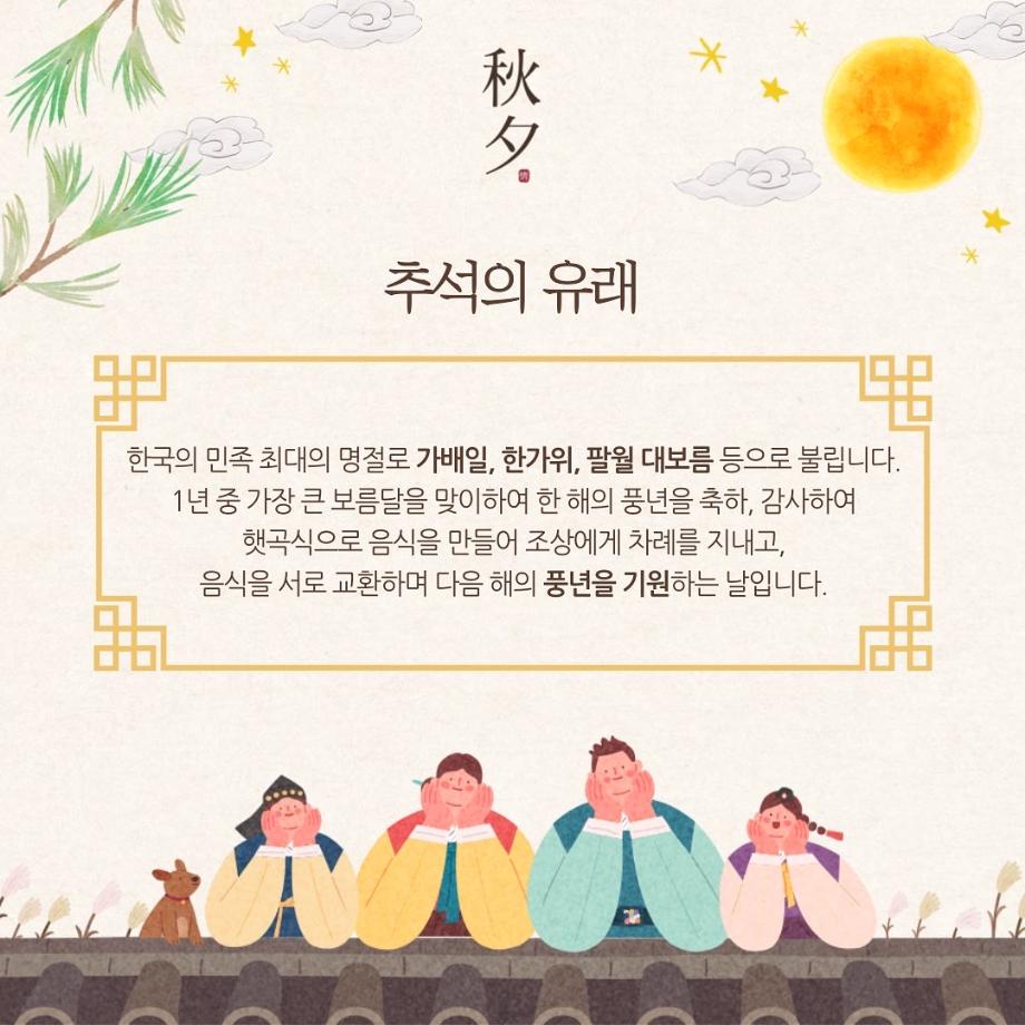 본문 시작 홈으로 학부소식 학부소개 교육과정 학부소식 커뮤니티 홈페이지가이드 미문한컷 공지사항 학사일정 학부행사 미문뉴스 미문한컷 포토갤러리 미문한컷 페이스북 트위터 프린트 미문 한 컷 | 일곱 번째 이야기 미디어문화학부 1688 2022-09-09 여러분 안녕하세요! 추석 연휴가 시작되었습니다 :) 혹시 추석의 유래를 알고 계신가요? 모르셨다면 카드뉴스를 통해 간단히 살펴보면 좋을 것 같아요! 다들 보름달처럼 마음마저 가득 찬 풍요로운 추석 보내시길 바랍니다! 긴 연휴, 잘 쉬고 건강한 모습으로 다시 만나요-! 목록 다음 미문 한 컷 | 여덟 번째 이야기 다음 미문 한 컷 | 아홉 번째 이야기 만족도조사 만족도 조사 이 페이지에서 제공하는 정보에 대하여 만족하시나요? 매우만족 만족 보통 불만족 매우불만족