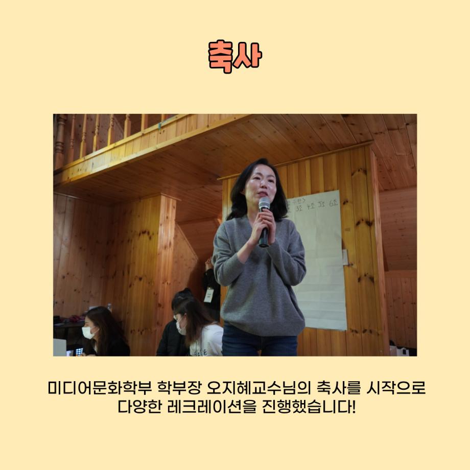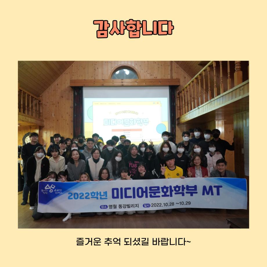 본문 시작 홈으로 학부소식 학부소개 교육과정 학부소식 커뮤니티 홈페이지가이드 미문한컷 공지사항 학사일정 학부행사 미문뉴스 미문한컷 포토갤러리 미문한컷 페이스북 트위터 프린트 미문 한 컷 | 열여섯 번째 이야기 미디어문화학부 1766 2022-11-17 미디어문화학부가 코로나19이후 3년 만에 영월 동강 빌리지로 MT를 갔다 왔습니다😎 10월 28일 (금) 모두 떨리는 마음으로 버스를 타고 세명대학교에서 출발하여 영월에 도착 후 짐을 풀고 맛있는 저녁식사를 하고 이후 교수님의 축사를 시작으로 다양한 레크리에이션 진행하였으며 레크리에이션 이후 잘 마무리하고 10월 29일 (토) 세명대학교에 잘 도착하였습니다. 앞으로 더 재미있는 MT를 진행하기 위해 노력하겠습니다! 감사합니다. 목록 이전미문 한 컷 | 열다섯 번째 이야기 다음 미문 한 컷 | 열일곱 번째 이야기 만족도조사 만족도 조사 이 페이지에서 제공하는 정보에 대하여 만족하시나요? 매우만족 만족 보통 불만족 매우불만족