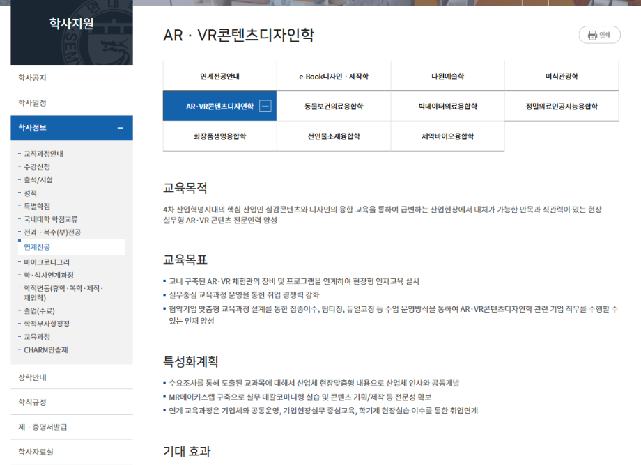 본문 시작 홈으로 학과과정 학과소개 학과과정 시영소식 입학/취업 AI 학과자랑 SNS소통 홈페이지가이드 AR·VR 연계전공 교육과정 모듈형교육과정 전공교육 체계도 AR·VR 연계전공 AR·VR 연계전공 페이스북 트위터 프린트 ARVR 연계 전공 소개 영상 시각영상디자인학과 485 2025-09-06 ARVR 연계 전공 소개 영상 https://www.semyung.ac.kr/kor/sub04_03_13_16.do 목록 이전호유당(제천약초한과)브랜드 리브랜딩- 수업과제 담당부서 : 시각영상디자인학과 담당자 : - 연락처 : 043-649-1726 최종수정일 : 2024-10-26 만족도조사 만족도 조사 이 페이지에서 제공하는 정보에 대하여 만족하시나요? 매우만족 만족 보통 불만족 매우불만족