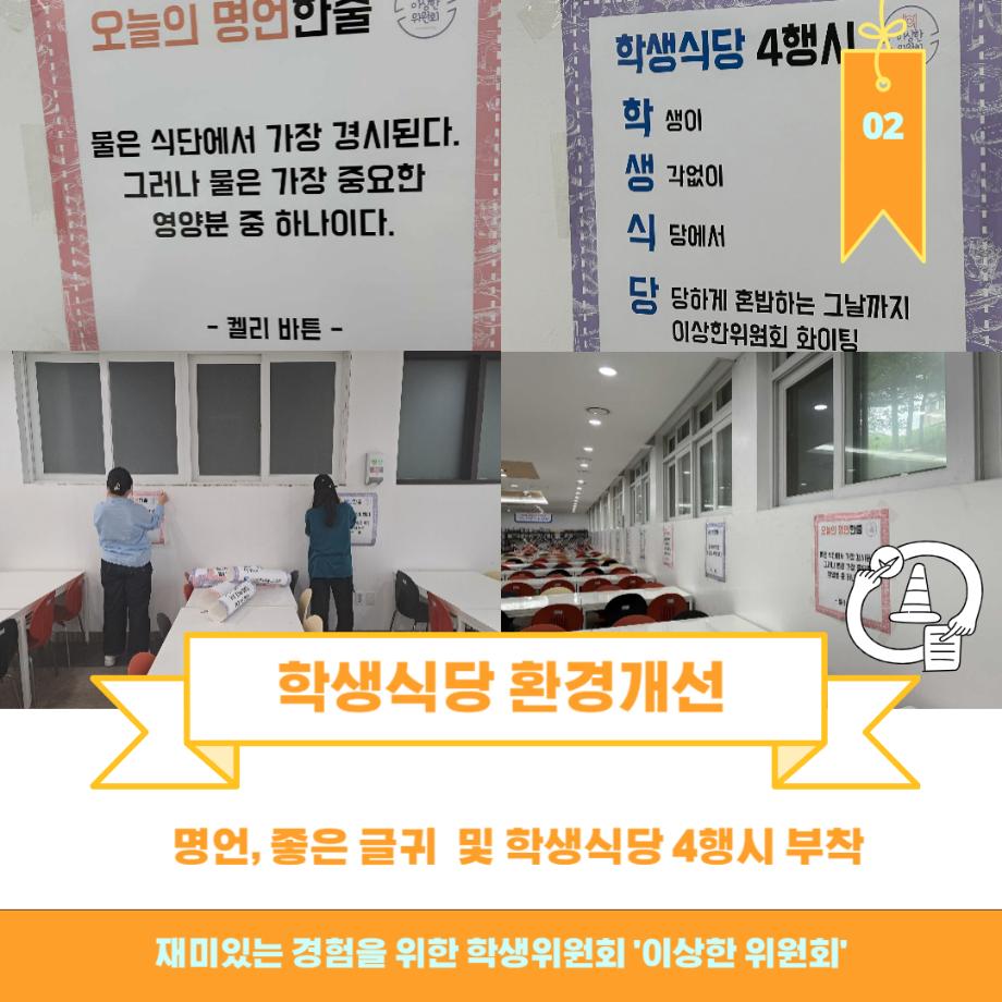본문 시작 홈으로 포토갤러리 학생위원회 개요 학생위원회 소개 공지사항 활동결과 홈페이지가이드 포토갤러리 페이스북 트위터 프린트 [이상한 위원회] 학생식당 환경개선 및 특별메뉴 판매 학생처 9125 2023-07-07 이상한위원회 특별메뉴 판매 목록 이전[학생위원회] 2023 간담회 및 유니폼 착복식 시행 이전[춤추는 위원회] 제 2회 청춘콘서트 담당부서 : 장학복지팀 담당자 : - 연락처 : 043-649-1142 최종수정일 : 2024-10-26 만족도조사 만족도 조사 이 페이지에서 제공하는 정보에 대하여 만족하시나요? 매우만족 만족 보통 불만족 매우불만족