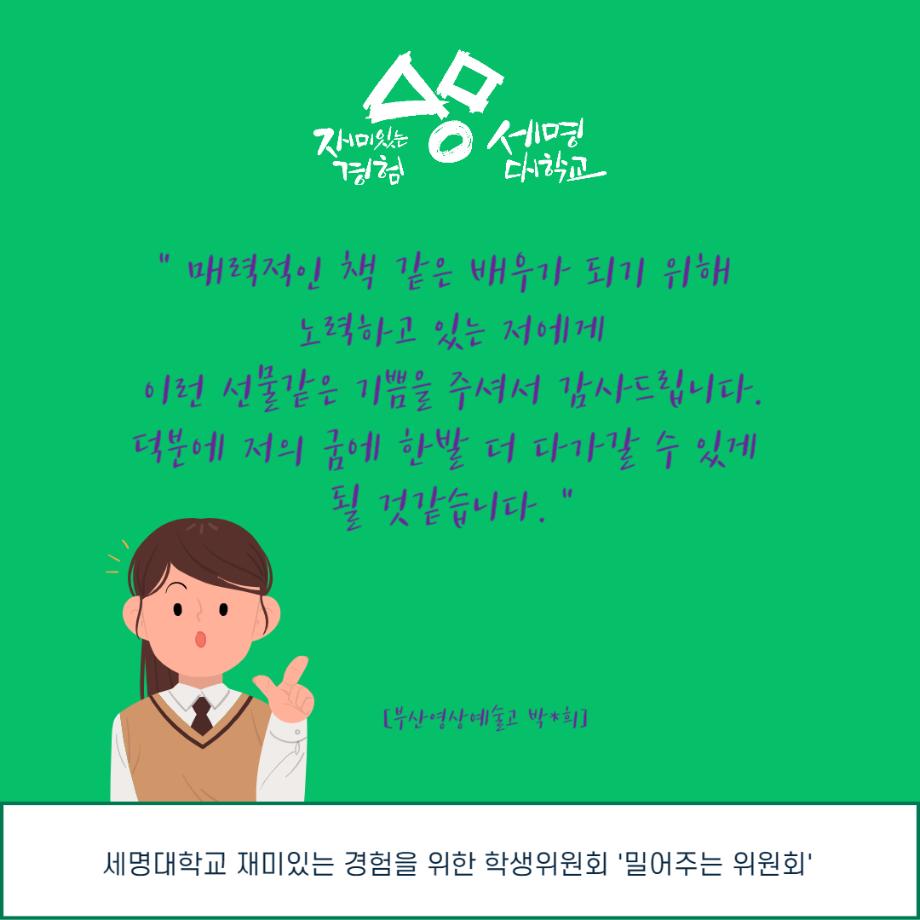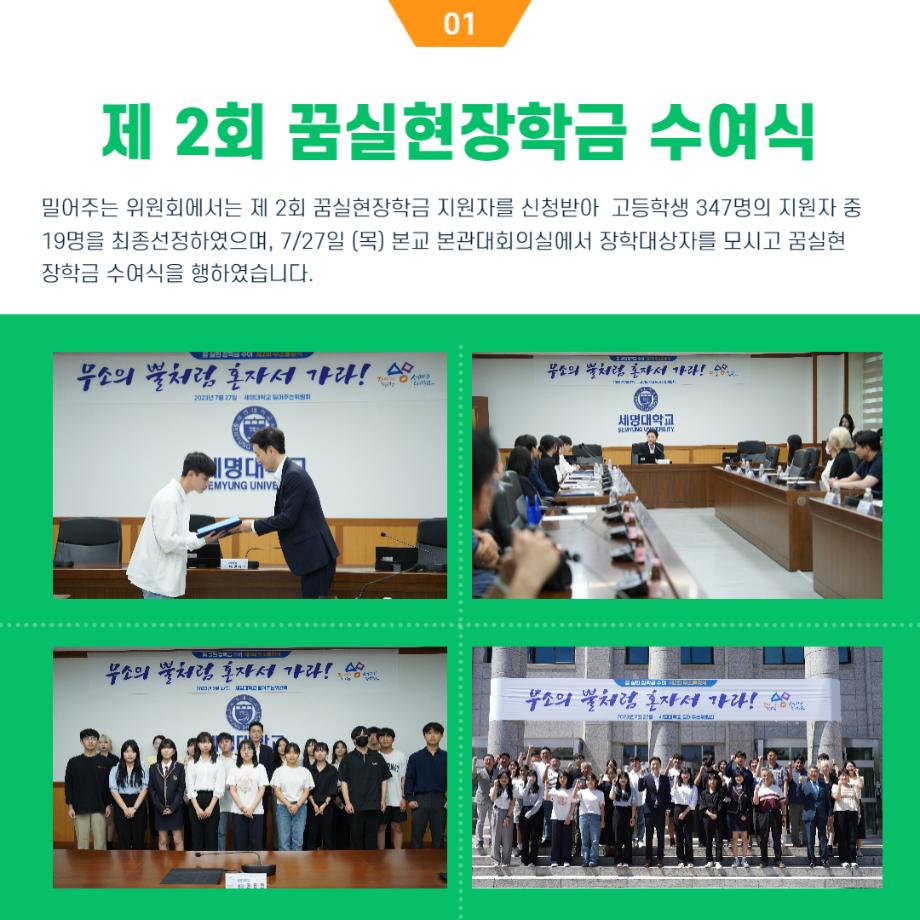 본문 시작 홈으로 포토갤러리 학생위원회 개요 학생위원회 소개 공지사항 활동결과 홈페이지가이드 포토갤러리 페이스북 트위터 프린트 [밀어주는 위원회] 제 2회 꿈실현장학금 수여식 [무소출정식] 입학관리본부 7071 2023-07-27 제 2회 꿈실현장학금 수여식 일정 : 2027.07.27 14시 본관 3층 대회의실 대상 : 꿈실현장학금 수헤자 19명 목록 이전[춤추는 위원회] 제 2회 청춘콘서트 이전[생각하는 위원회] 생각게시판 결과 담당부서 : 장학복지팀 담당자 : - 연락처 : 043-649-1142 최종수정일 : 2024-10-26 만족도조사 만족도 조사 이 페이지에서 제공하는 정보에 대하여 만족하시나요? 매우만족 만족 보통 불만족 매우불만족