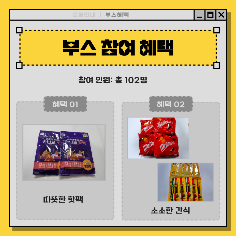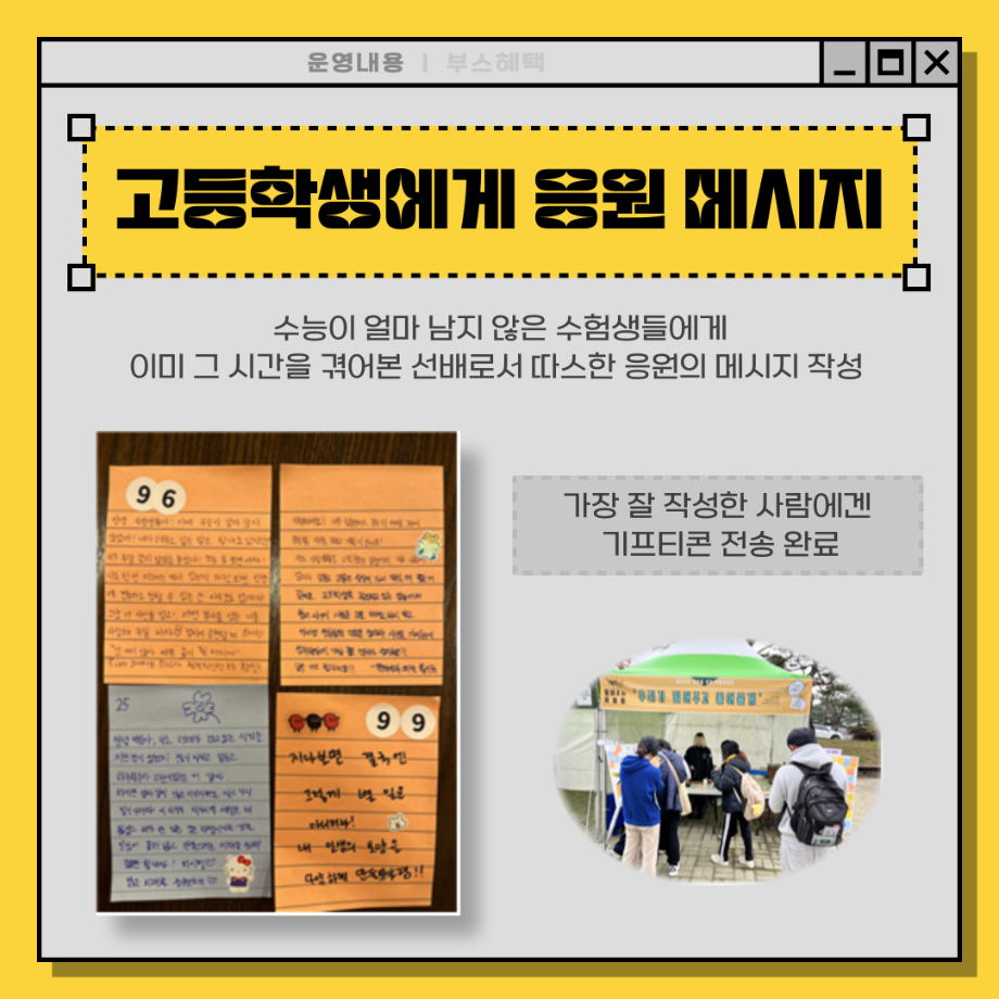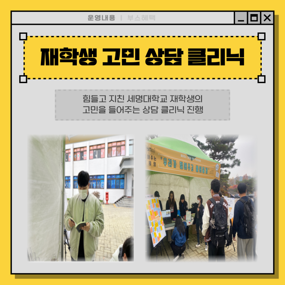 본문 시작 홈으로 포토갤러리 학생위원회 개요 학생위원회 소개 공지사항 활동결과 홈페이지가이드 포토갤러리 페이스북 트위터 프린트 [밀어주는 위원회] 2023년 2학기. 두 번째 행사 입학관리본부 3282 2023-11-09 1. 행사일정 : 2023.11.01.(수) 2. 행사장소 : 세명스퀘어(학생회관 앞 광장) 3. 행사내용 - 세명대학교 재학생들이 고3 수험생들에게 수능 응원 메시지 보내기 - 재학생 고민 상담 클리닉 4. 행사참여인원 : 102명 목록 이전[착한 위원회] 2023-2학기 포롱포롱 공방 운영 결과 다음 [착한위원회] 최종보고회 착한위원회SNS팔로우 이벤트 담당부서 : 장학복지팀 담당자 : - 연락처 : 043-649-1142 최종수정일 : 2024-10-26 만족도조사 만족도 조사 이 페이지에서 제공하는 정보에 대하여 만족하시나요? 매우만족 만족 보통 불만족 매우불만족