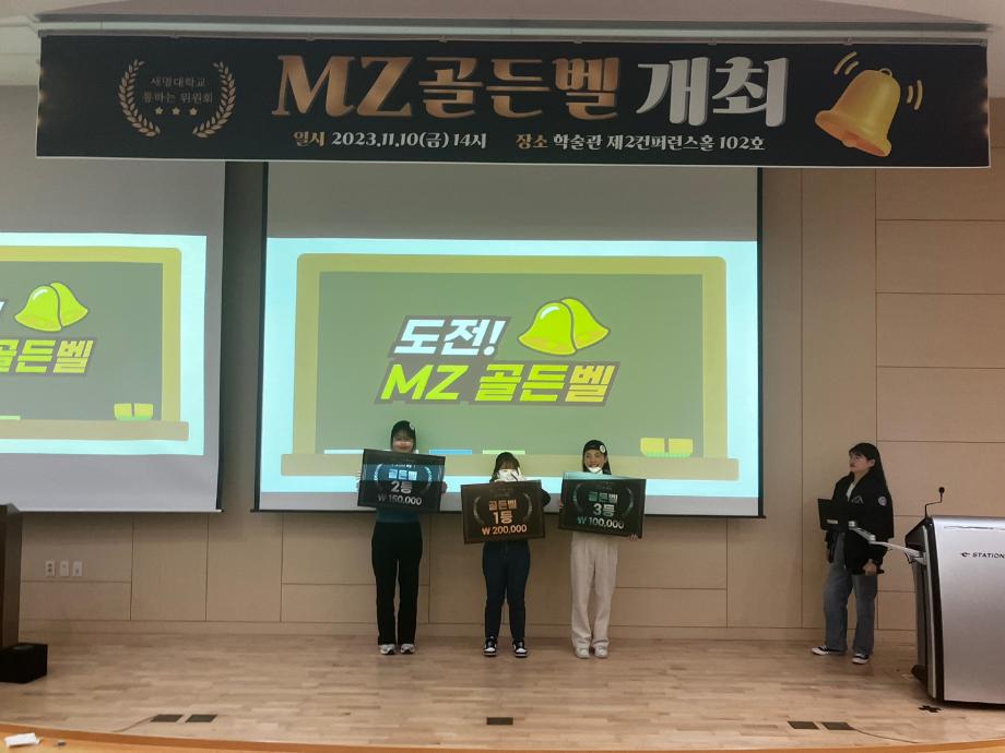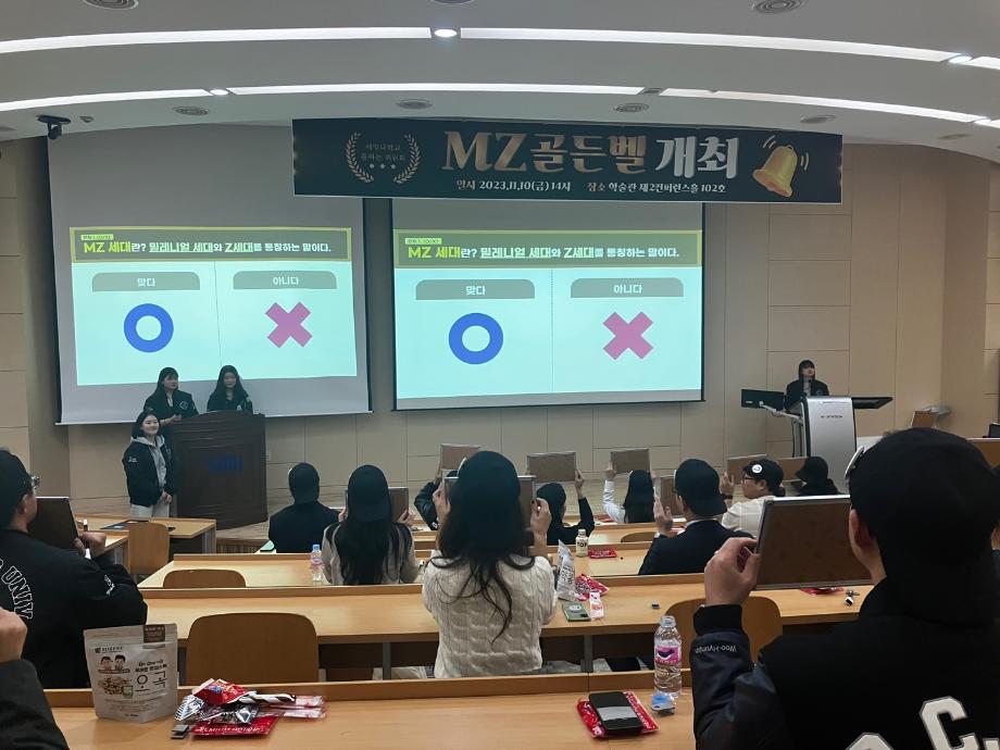 본문 시작 홈으로 포토갤러리 학생위원회 개요 학생위원회 소개 공지사항 활동결과 홈페이지가이드 포토갤러리 페이스북 트위터 프린트 [통하는위원회] 통하는 위원회 < MZ골든벨 > 2886 2023-11-22 1. 행사일시 : 23년 11월 10일(금) 14시~16시 2. 행사장소 : 학술관 102호 3. 행사개요 : 세대 문화를 주제로 미니 골든벨을 개최하여 교직원과 재학생들이 서로의 문화를 배우고 소통할 수 있는 계기 마련 4. 행사내용 - 다양한 세대 문제를 출제하여 서로의 문화를 배우고 소통함 - 참여자 10명에게 랜덤 MZ 상품 증정 - 최종 3인에게 상금 증정 5. 참여인원 : 28명 목록 이전[ 통하는 위원회] MZ옷코디콘테스트 다음 [통하는 위원회] 최종보고회 부스 담당부서 : 장학복지팀 담당자 : - 연락처 : 043-649-1142 최종수정일 : 2024-10-26 만족도조사 만족도 조사 이 페이지에서 제공하는 정보에 대하여 만족하시나요? 매우만족 만족 보통 불만족 매우불만족