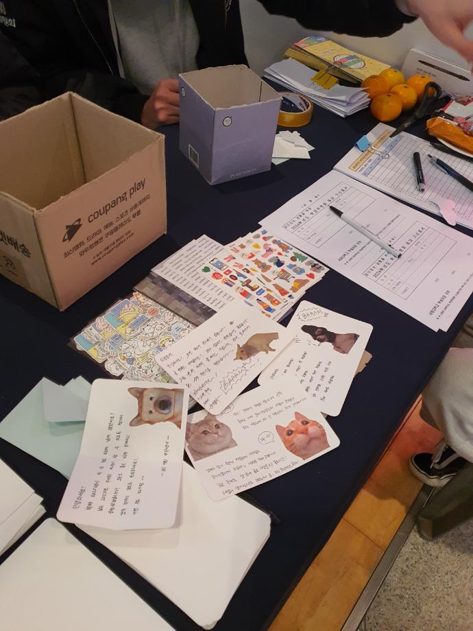 - 익명의 편지 교환(익명에게 보내는 편지를 작성하고 익명이 쓴 편지를 가져감)