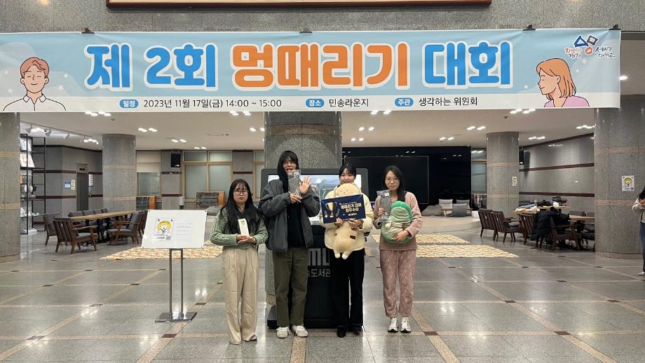 본문 시작 홈으로 포토갤러리 학생위원회 개요 학생위원회 소개 공지사항 활동결과 홈페이지가이드 포토갤러리 페이스북 트위터 프린트 [생각하는 위원회] 제 2회 멍때리기 대회 학술정보 2151 2023-11-17 <제 2회 멍때리기 대회> 일시 : 2023.11.17(금)14:00 참여자 : 17명 수상상품 : 1등_바디필로우 2등_춘식이 팔쿠션 3등_스피디 보조배터리 베스트드레서상_ 장갑 목록 다음 [알려주는 위원회] 최종보고회 부스운영 다음 [꽃피는 위원회] 제 3회 벚꽃축제 담당부서 : 장학복지팀 담당자 : - 연락처 : 043-649-1142 최종수정일 : 2024-10-26 만족도조사 만족도 조사 이 페이지에서 제공하는 정보에 대하여 만족하시나요? 매우만족 만족 보통 불만족 매우불만족