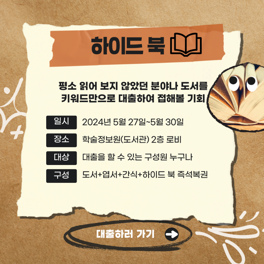하이드 북은 체전 부스에서 추천받았던 인생책과 위원회 자체 선발을 통해 선정한 도서를 포장하여 다른 구성원이 키워드만 보고 대출함으로써 같은 책을 공유하지만 다른 생각을 할 수 있게 하는 프로그램입니다.